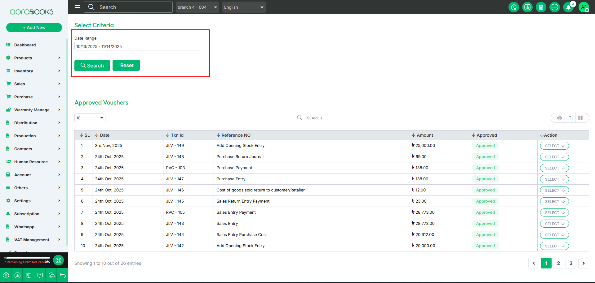 Date Range: Select the date range to see the list of transaction vouchers within a specific period.