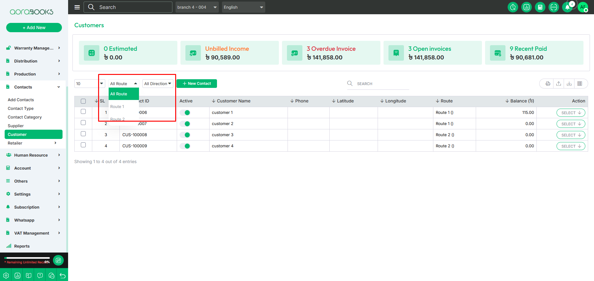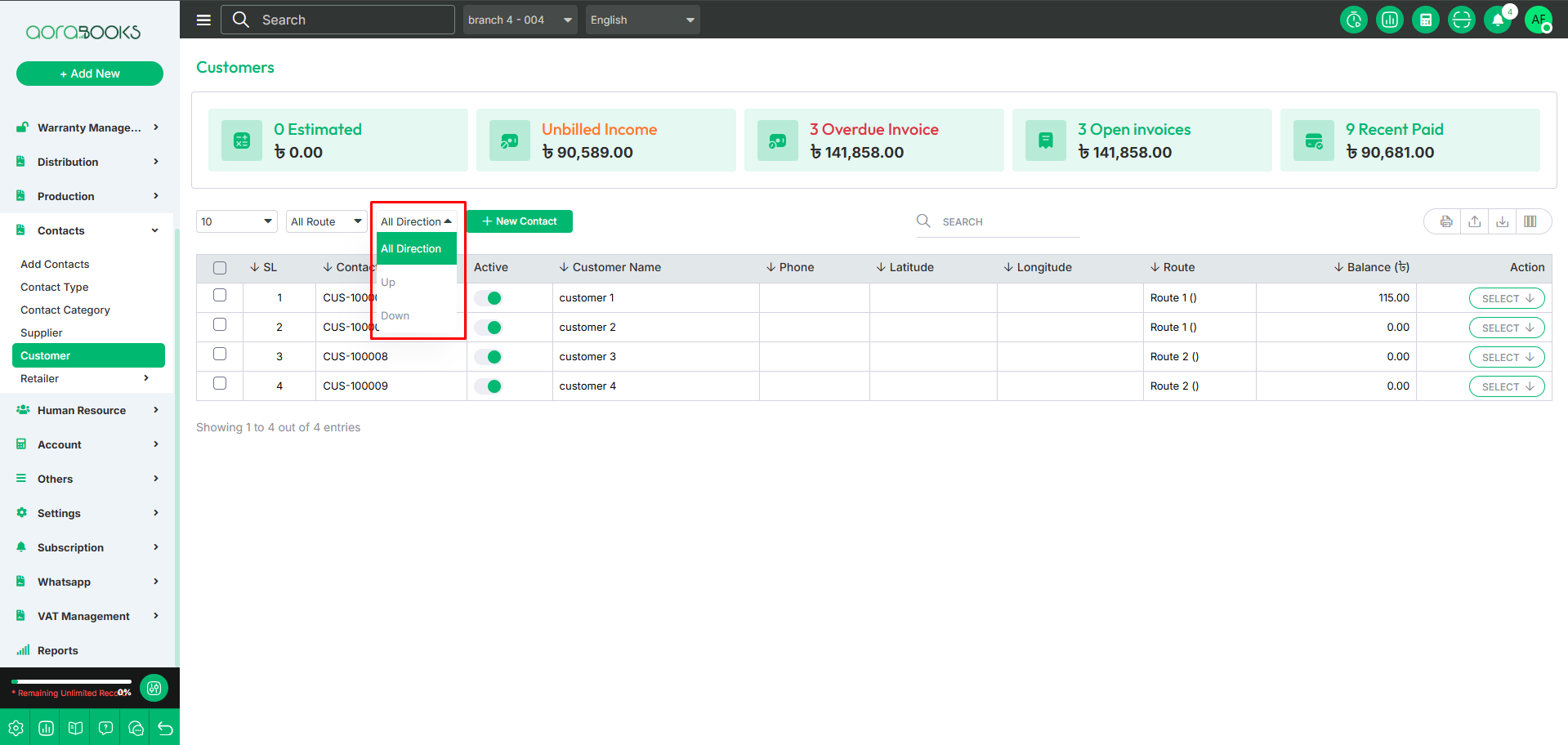 Advance filter: You can filter specific customers by selecting the Route and Direction.