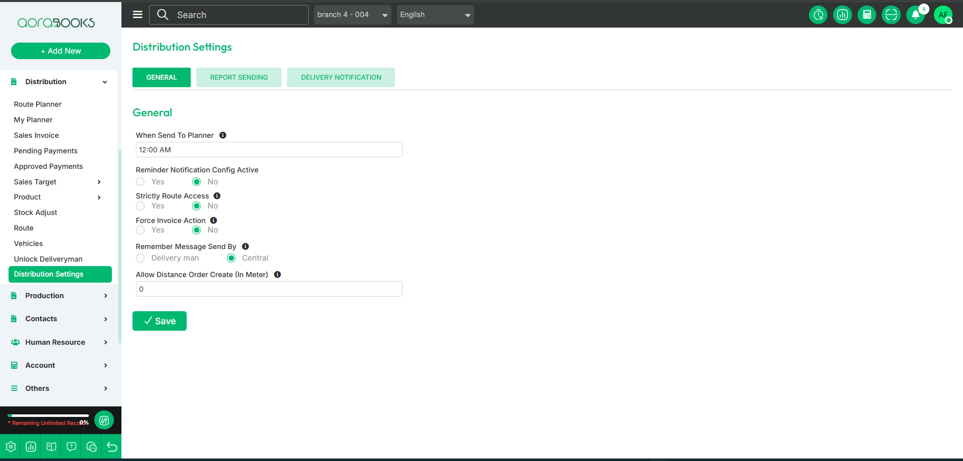 When Send To Planner: Invoice delivery status will be updated based on the given time. Reminder Notification Config Active: Enables or disables reminder notifications. Strictly Route Access: When enabled, users can only access customers or tasks that belong strictly to their assigned route. Force Invoice Action: If enabled, the system forces the user to perform required invoice-related actions before proceeding. Remember Message Send By: Determines who is considered the sender of system messages or notifications. Allow Distance Order Create (in meter): Sets the maximum distance (in meters) within which a user is allowed to create an order, ensuring location-based control.