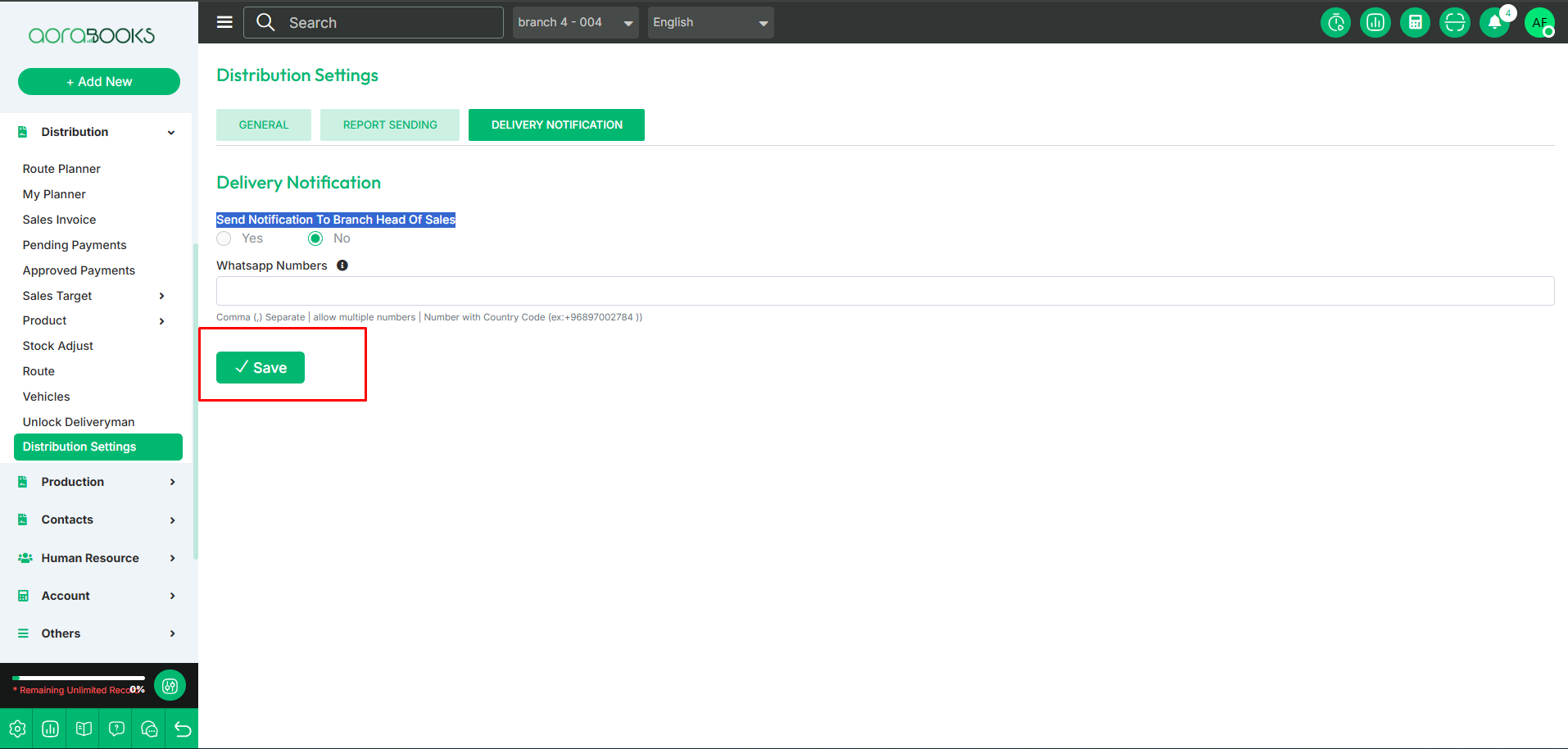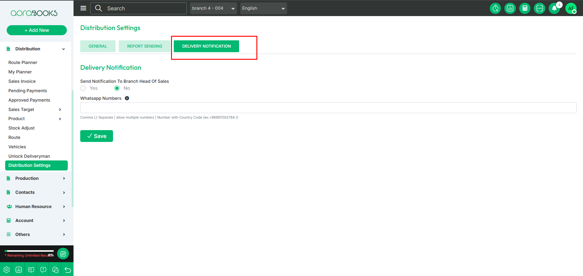 Send Notification to Branch Head of Sales: Select " yes or no.