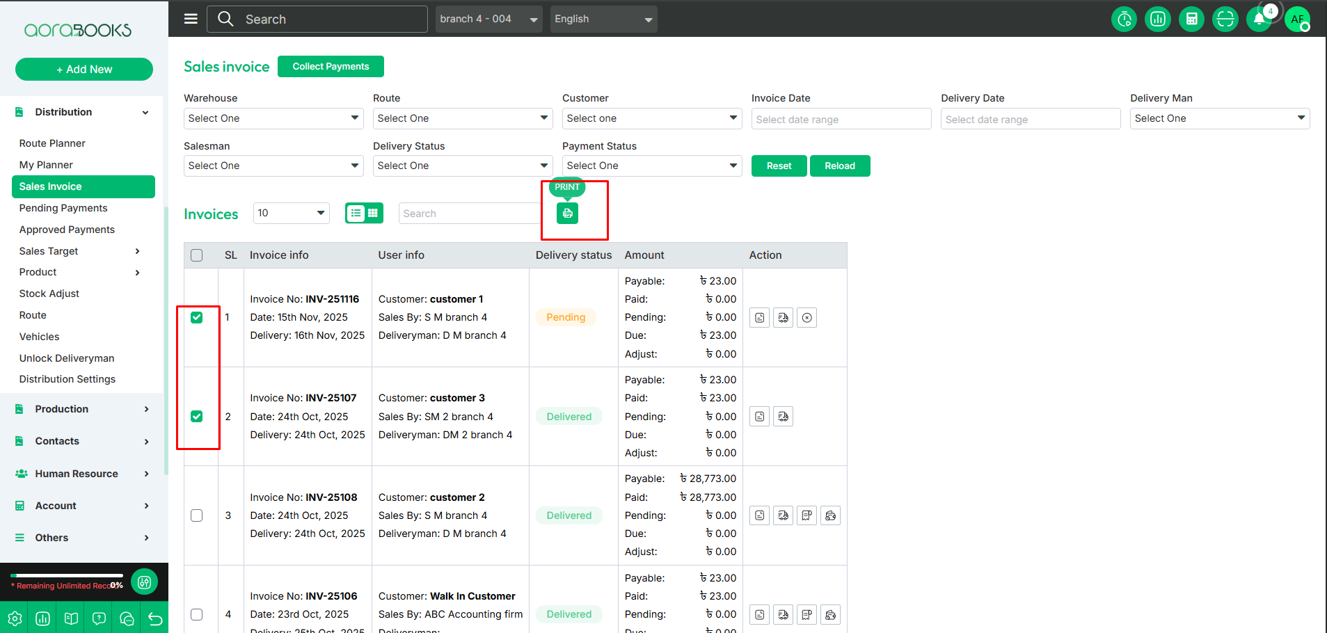 Print invoice: You can print invoices from here by selecting invoice and clicking on the print button.