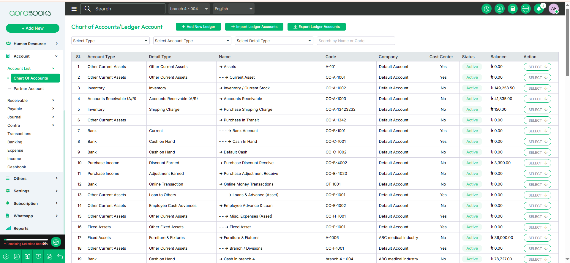 In the charts of accounts, you have all the chats of accounts listed. You can add ledger accounts and also can export ledger accounts from here.