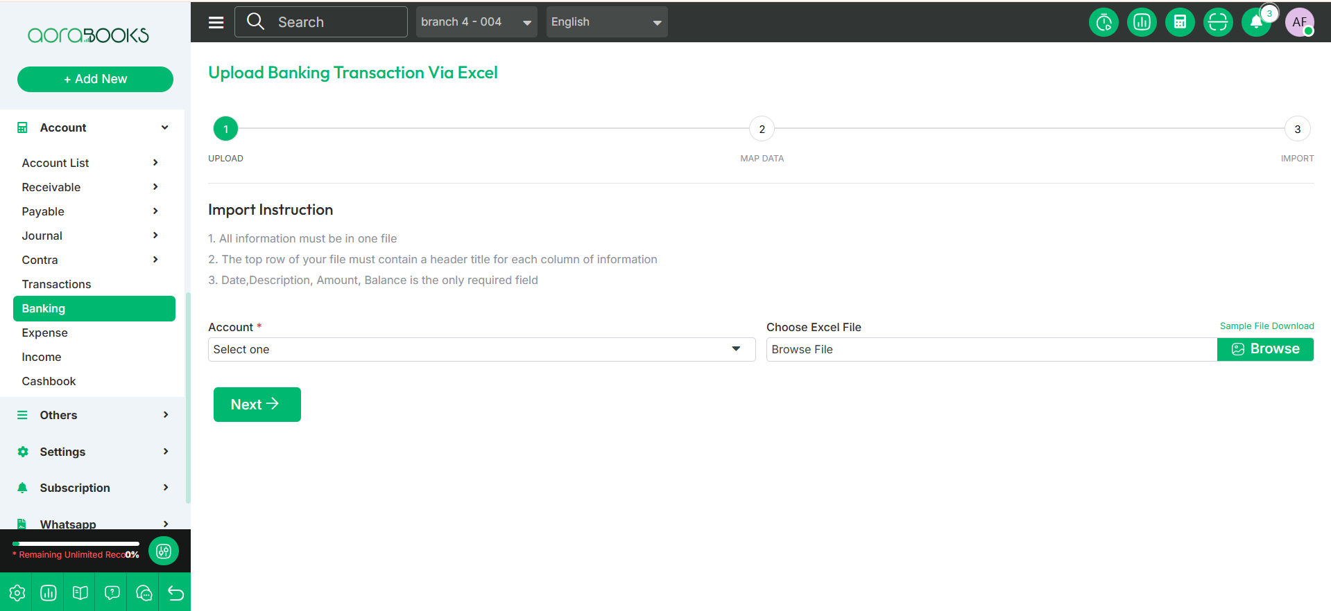 Banking transactions will be shown here. You can add multiple transactions by uploading Excel files. A sample file has been given here.