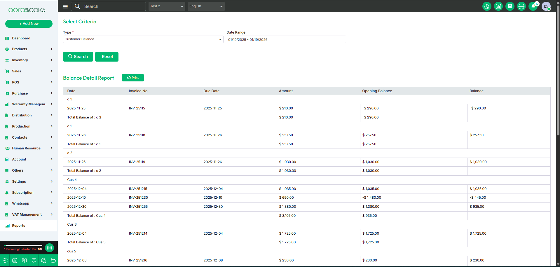 The Balance Detail Report provides a detailed view of account balances, including customer, supplier, and internal accounts. It helps track outstanding receivables, payables, and overall financial position.