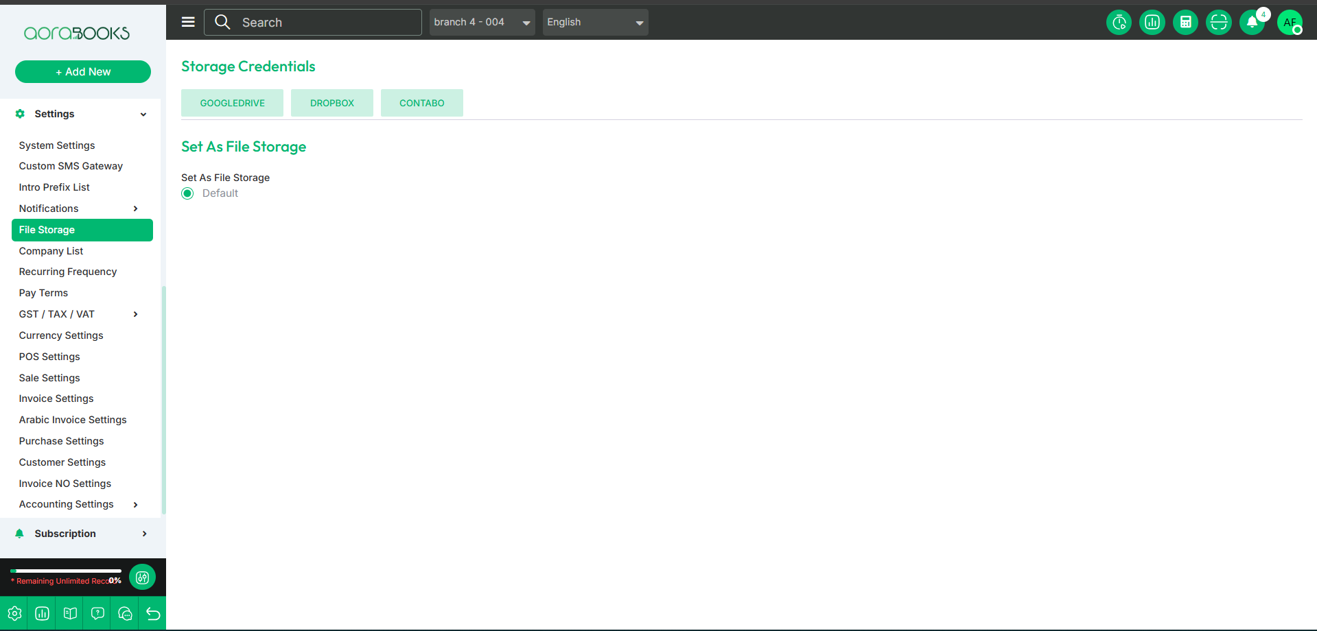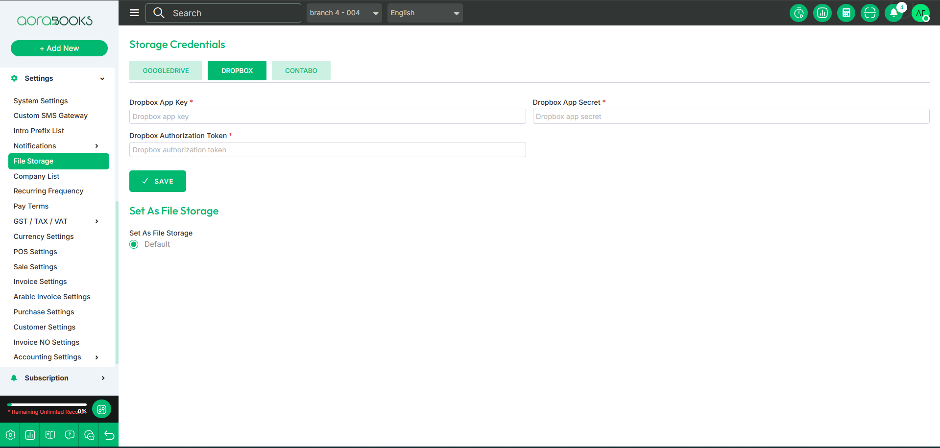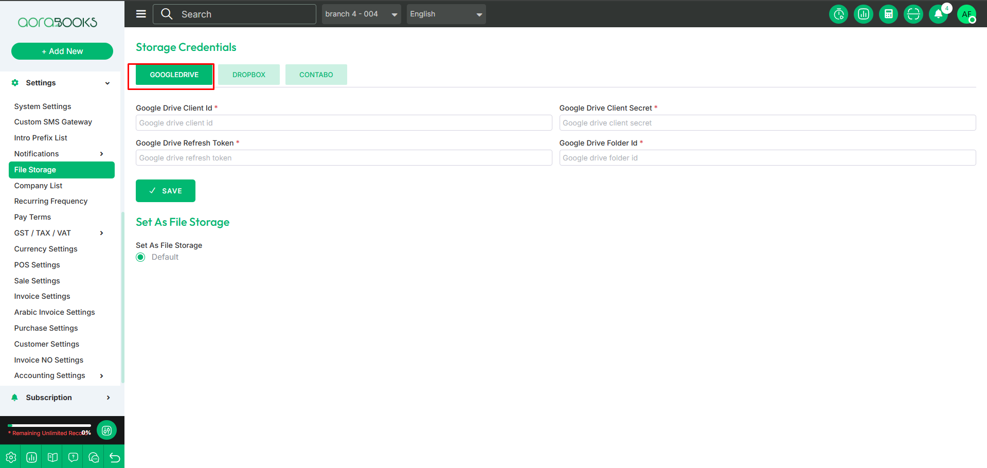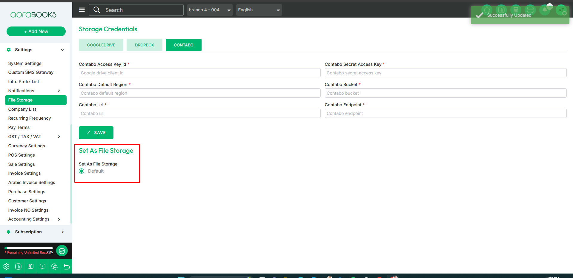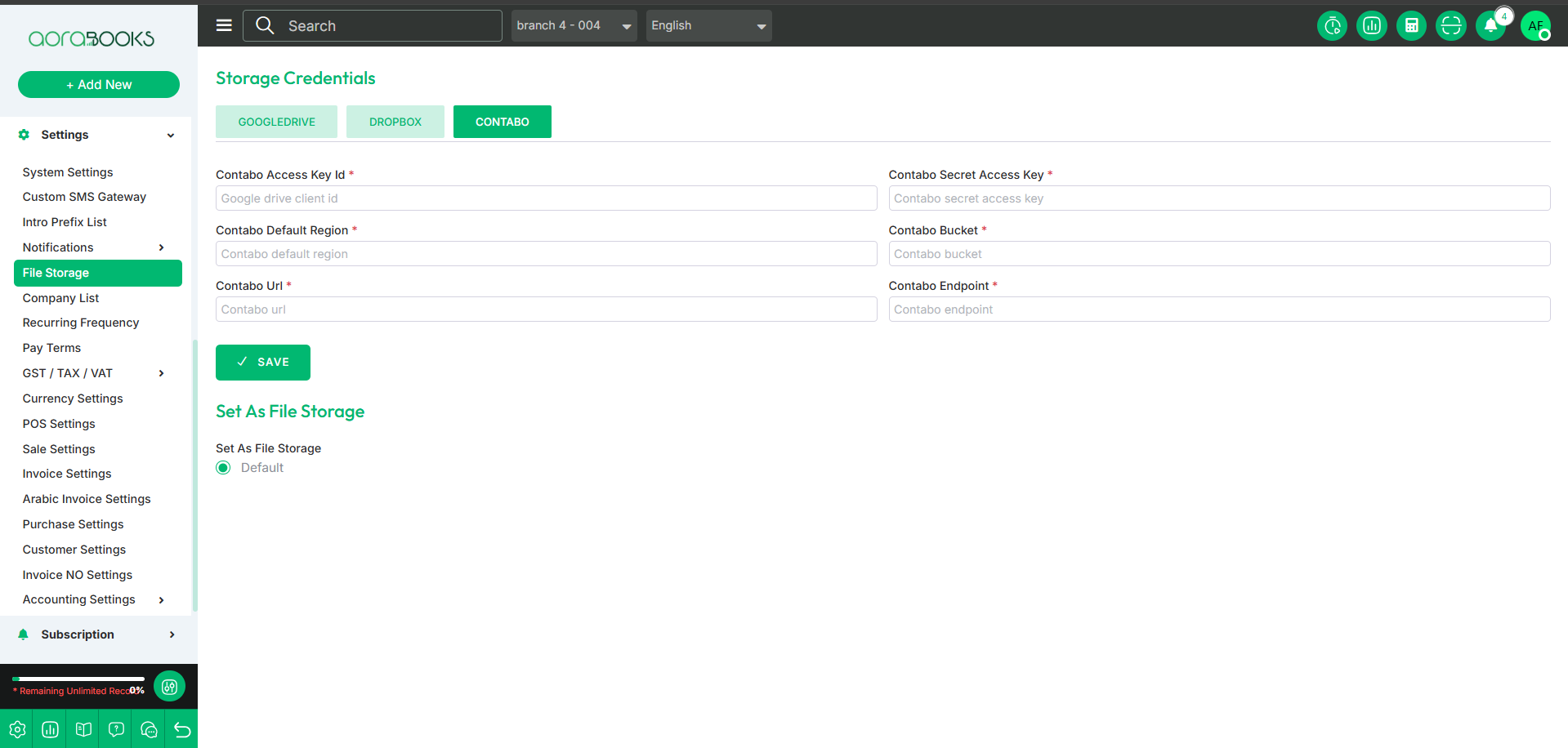 File Storage is a feature that allows you to manage and store files securely within the system. You can upload, organize, and access files easily. From here you can set your file storage. And you can also set the credentials for file storage from here. They are given below: