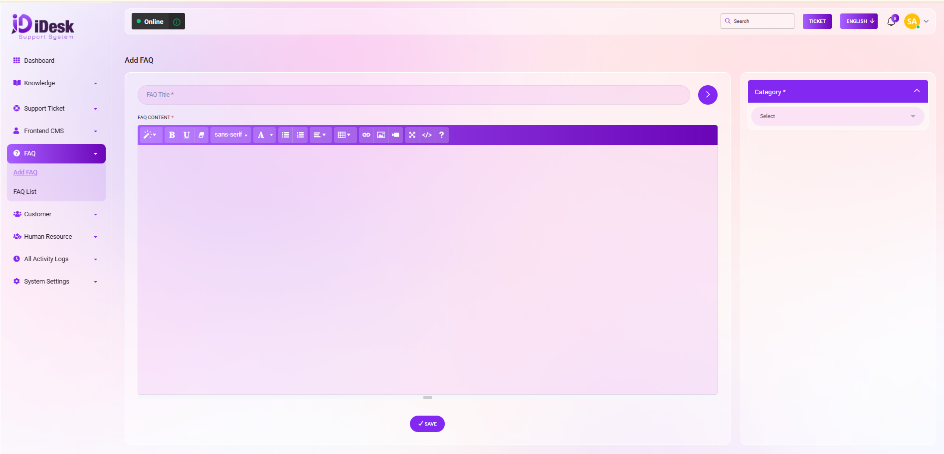 To incorporate a Frequently Asked Questions (FAQ) entry, commence by entering the FAQ Title. Subsequently, expound upon the details within the designated text box beneath the FAQ Title. To designate the appropriate category for the FAQ just select the categories and conclude the process by clicking on the SAVE button to preserve the FAQ entry.