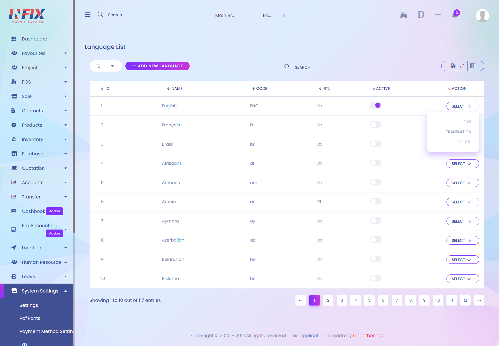 In action menu you can edit, translation and delete language from the list.