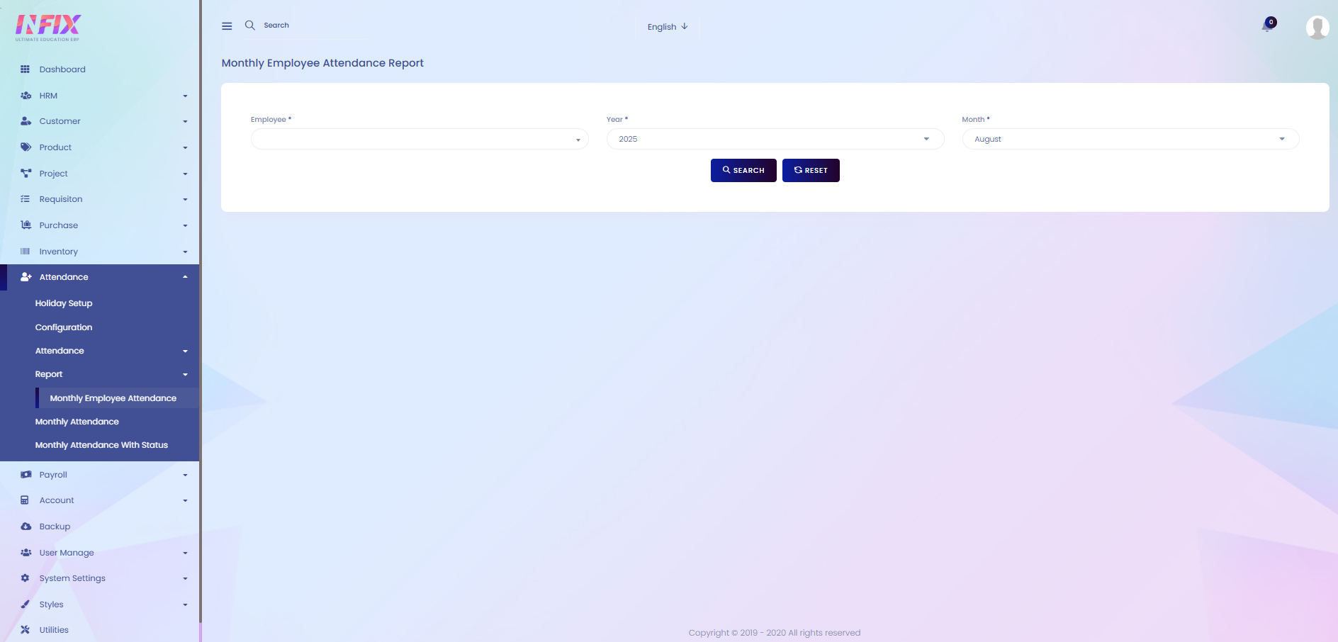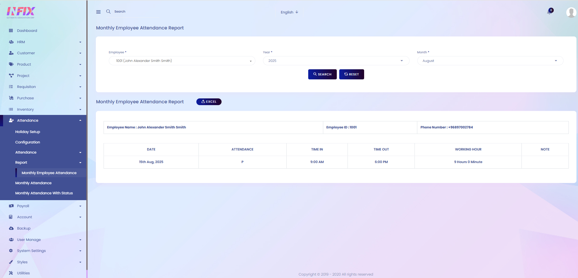 This report provides a detailed summary of each employee’s attendance for the selected month, including counts of presents, lates, absents, leaves/vacations, and holidays, helping track overall attendance performance.