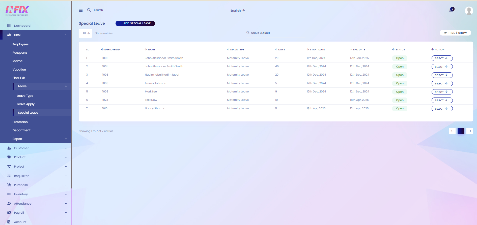 From here, you can view all special leave records with details, such as: