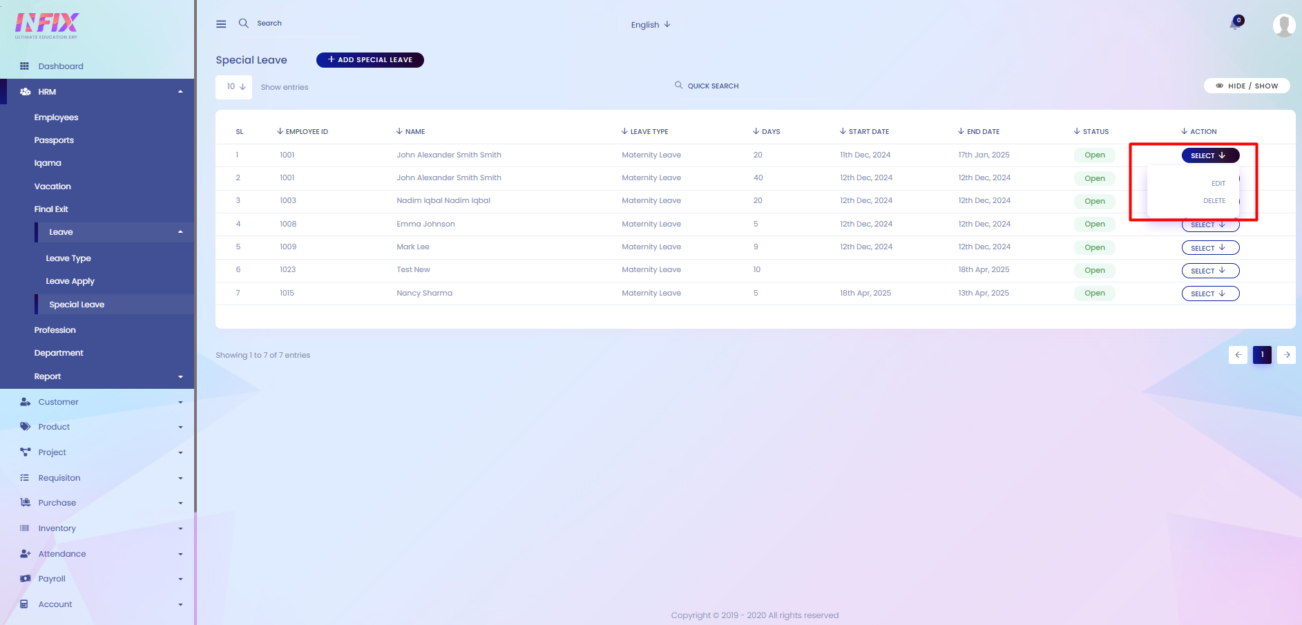 Delete: Remove the special leave record from the system.