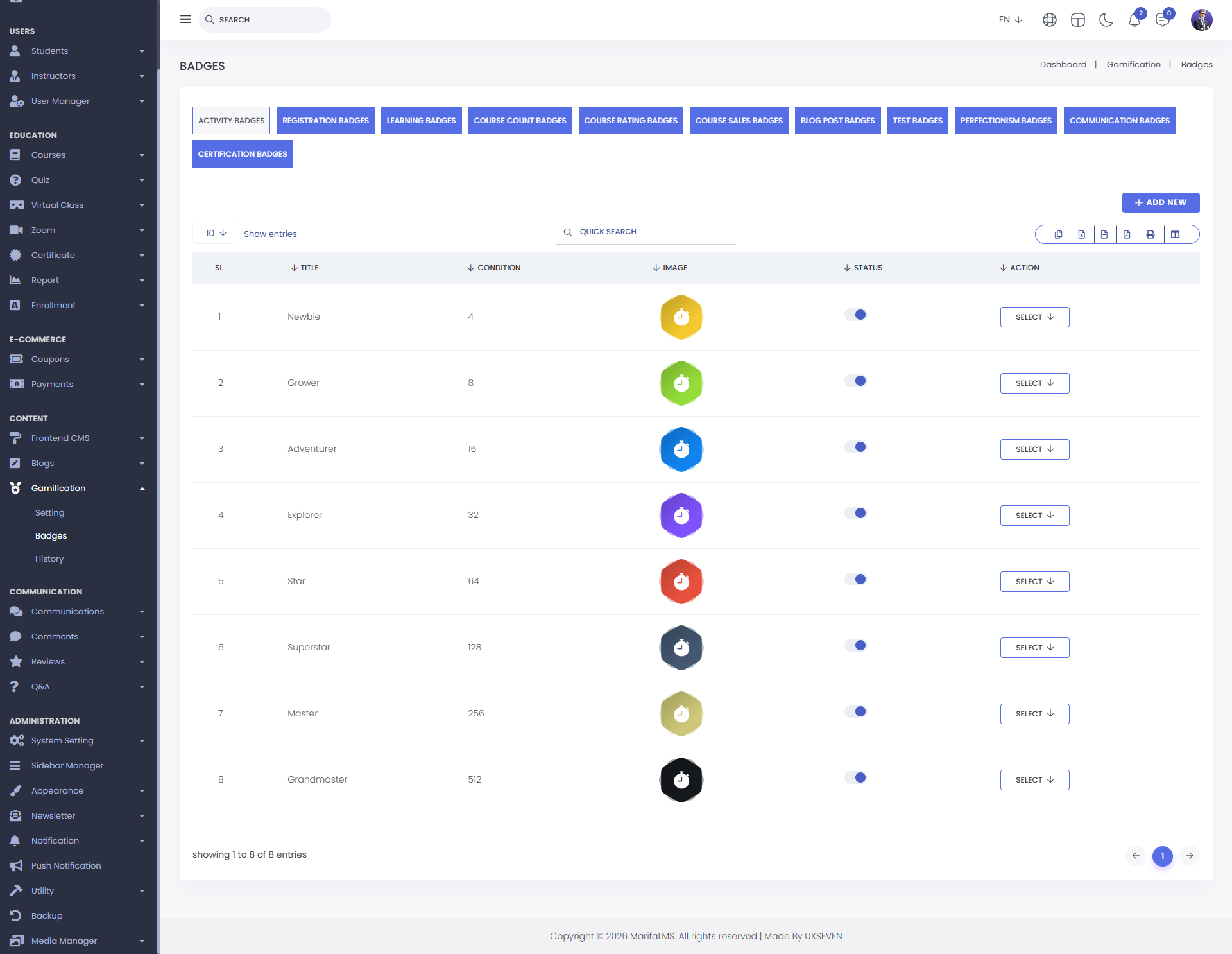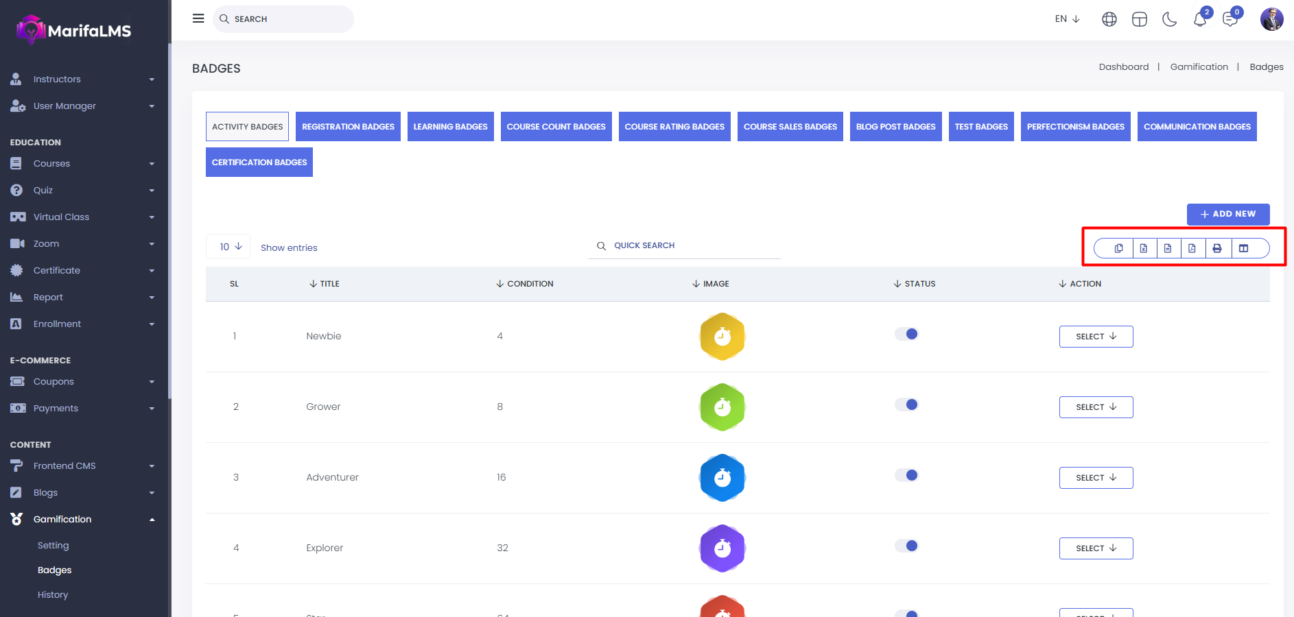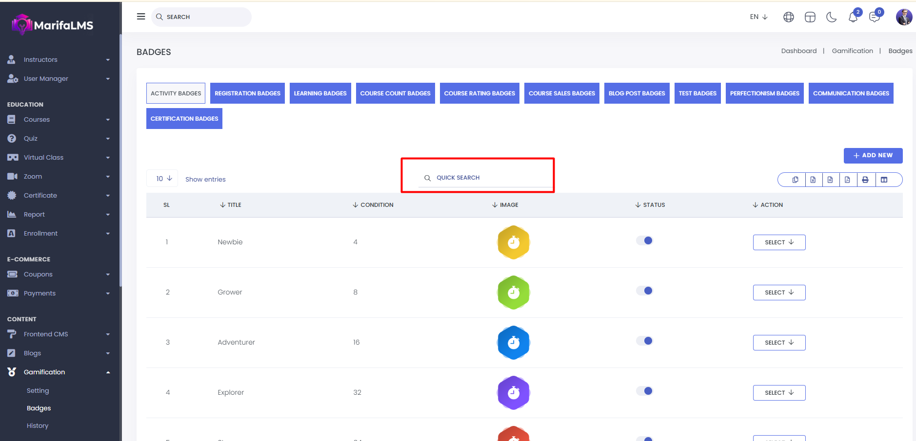 Badges : From here, you can view the complete list of badges. The details include SL, title, condition, image, status, and action.