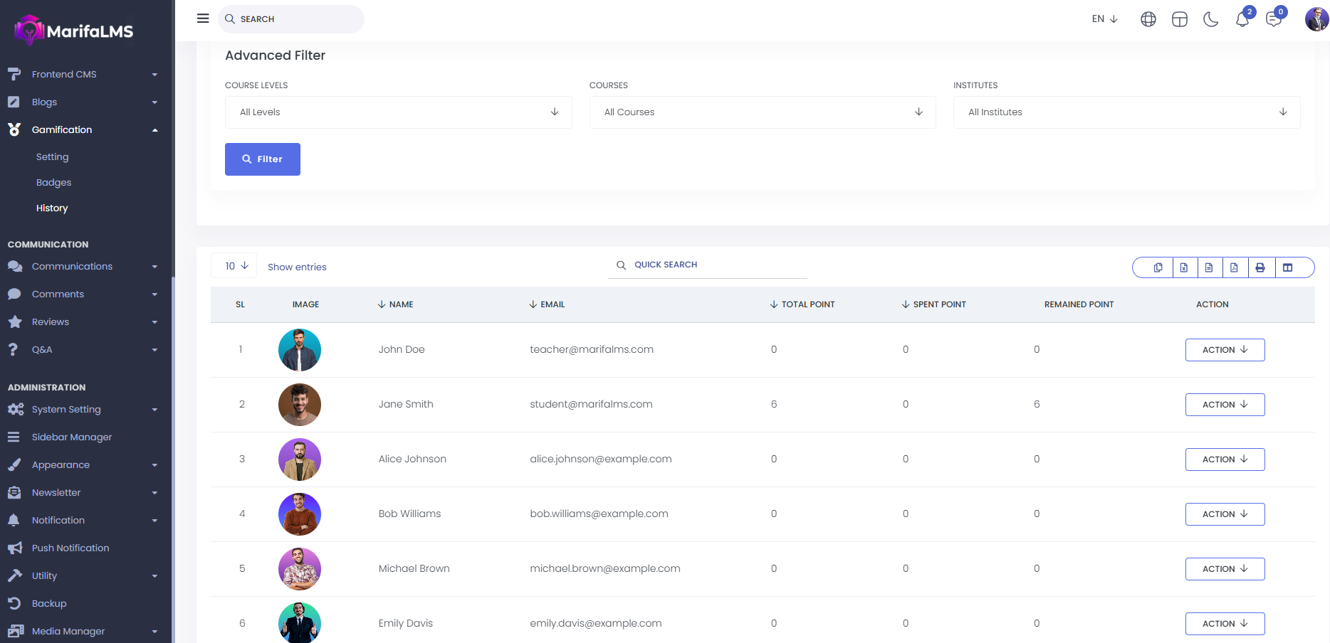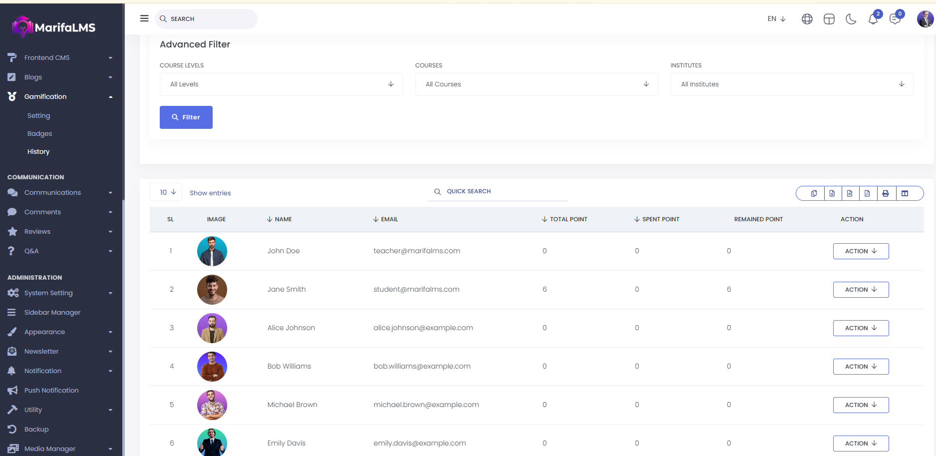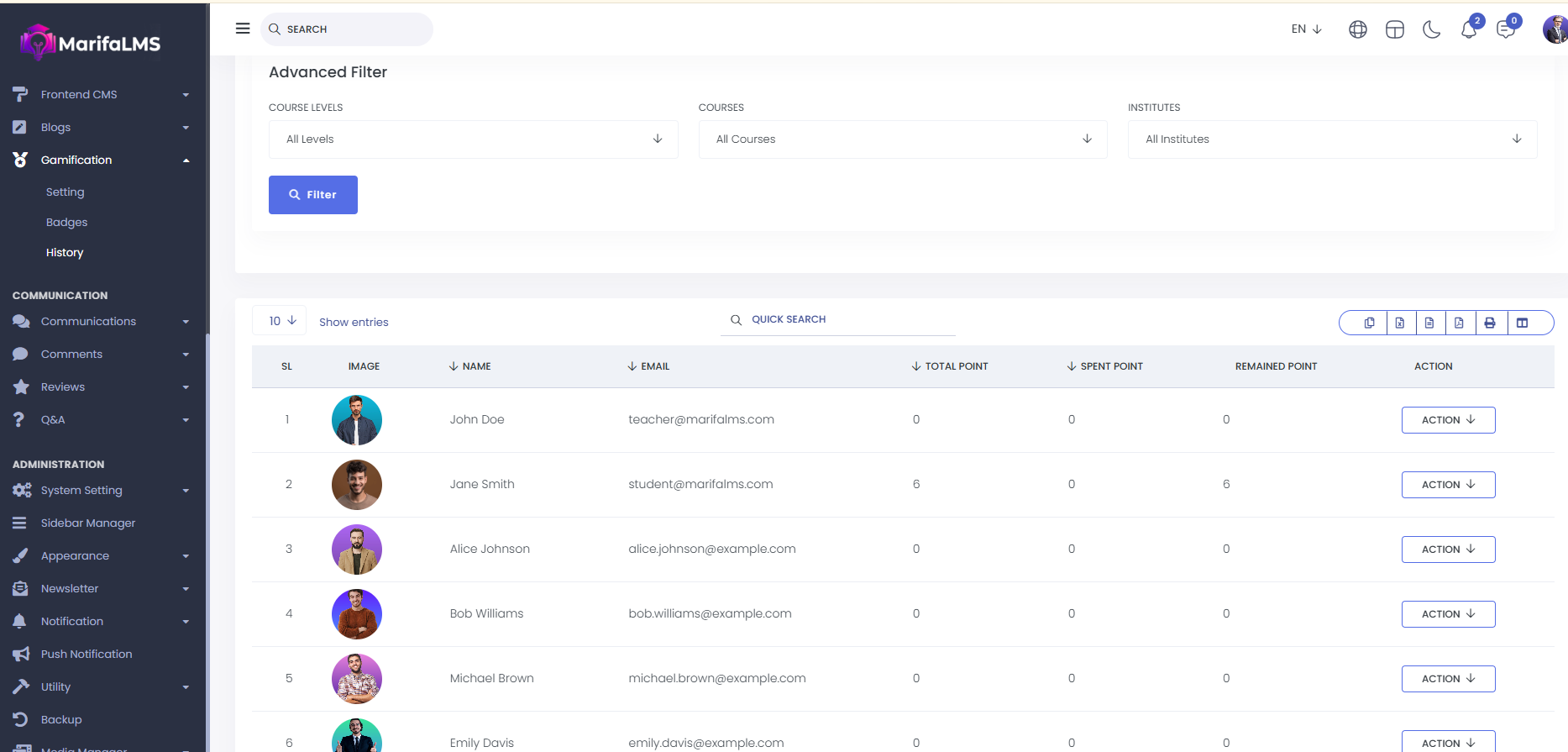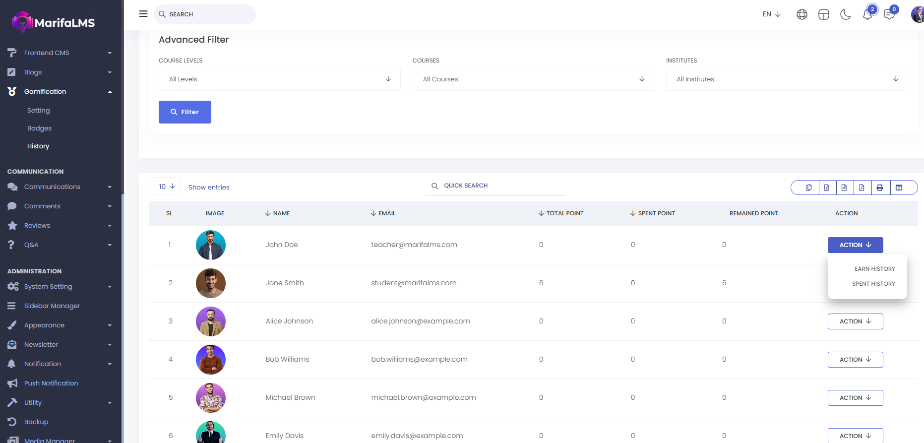 History : From here, you can view the entire gamification history list for both instructors and students. The details include SL, image, name, email, total points, spent points, remaining points, and action.