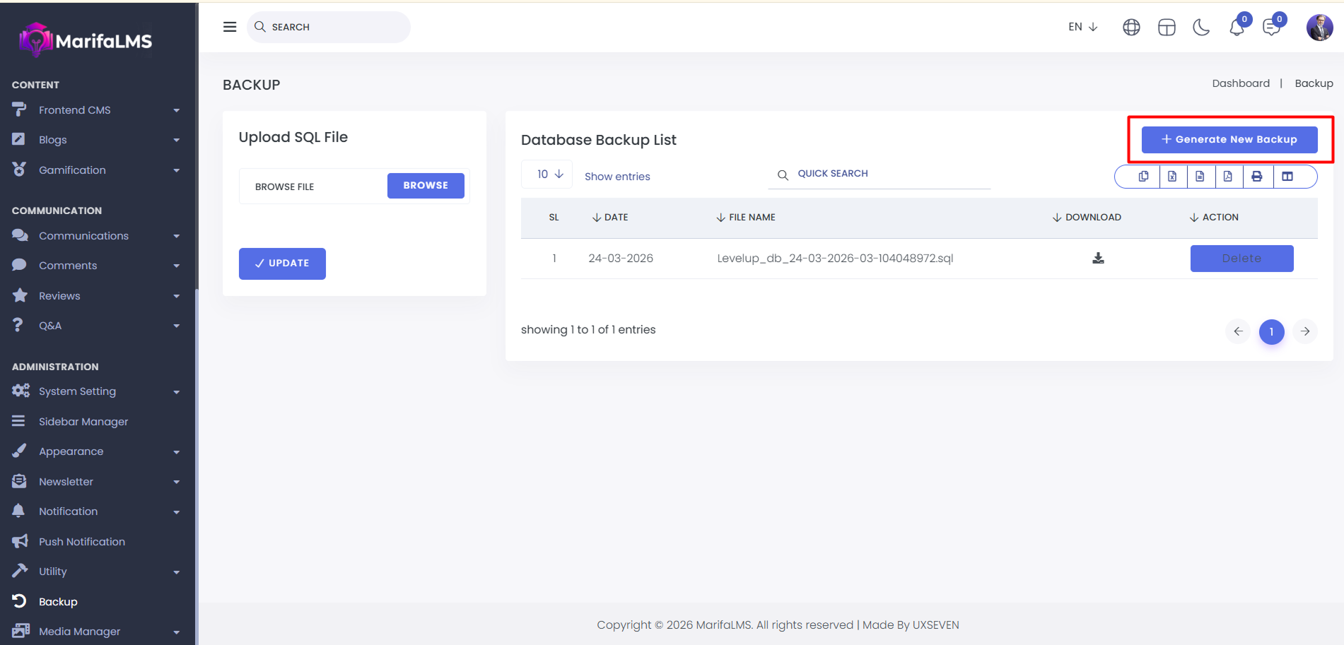 To create a manual backup of your system and database, click on Generate New Backup.