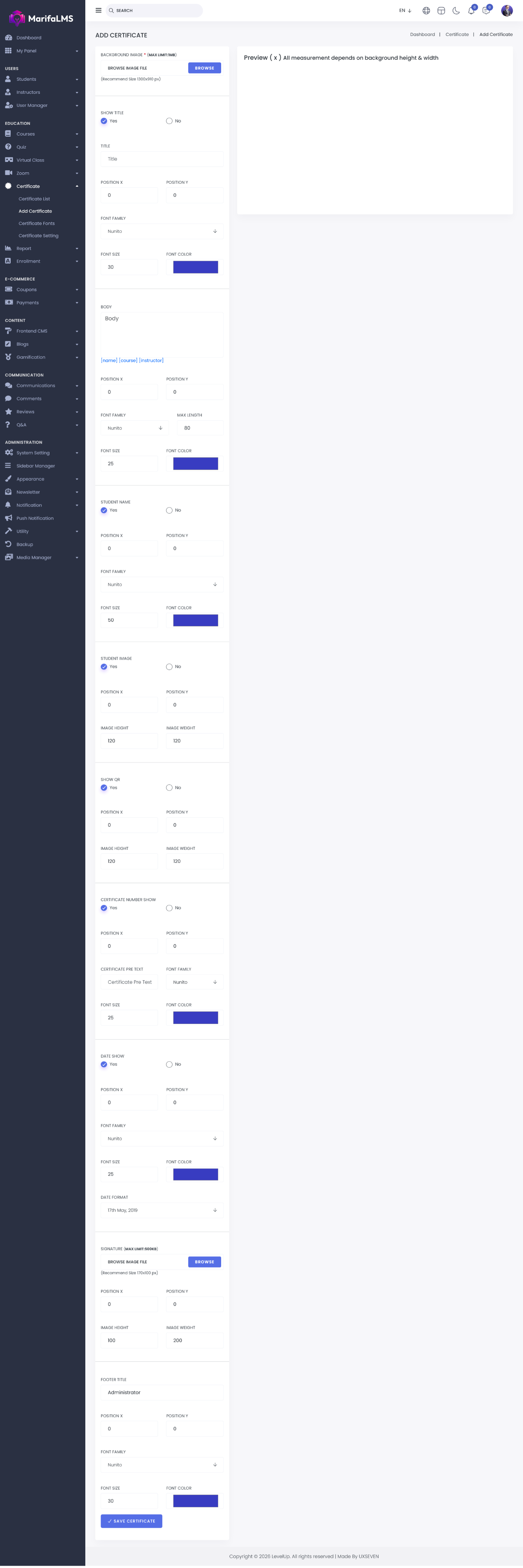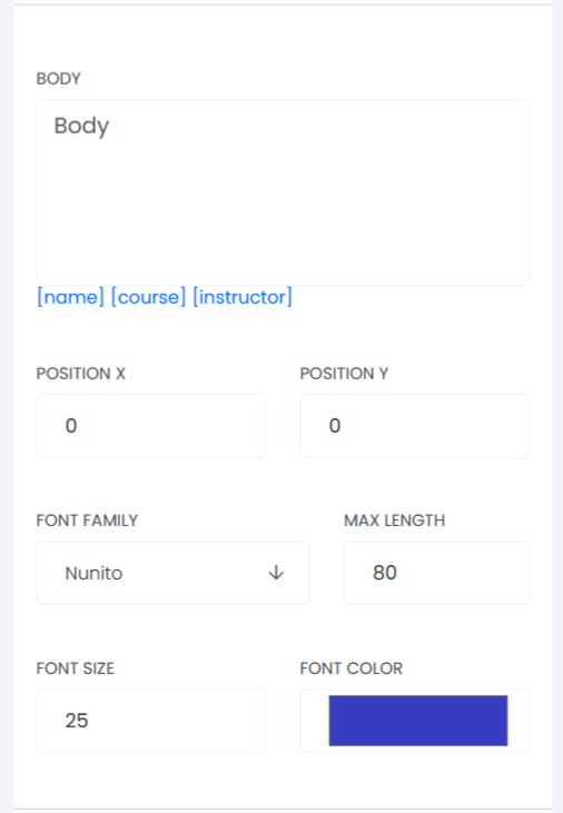 Body: This section allows users to add and customize the certificate’s body text. You can define the maximum text length, adjust the text position, and configure styling options including font type, font size, and font color to ensure the content aligns with the desired design.
