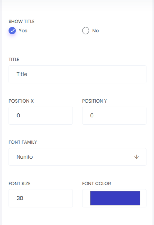 Title: This field allows users to add a title to the certificate. You can control the visibility of the title (show or hide), adjust its position, and customize its appearance by setting the font, font size, and font color.