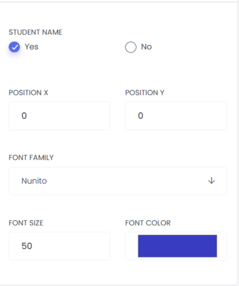 Student Name: This option allows you to control whether the student’s name will be displayed on the certificate by selecting Yes or No. You can also customize the position of the student’s name, as well as adjust its font style, font size, and font color to match your certificate design.