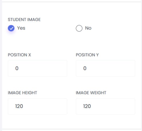 Student Image: This option allows you to control whether the student’s image is displayed on the certificate by selecting Yes or No. You can also define the image position and customize its dimensions, including height and width, to ensure proper alignment within the certificate layout.