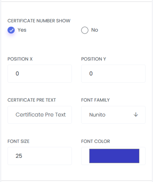 Certificate Number Show: This setting allows users to control whether the certificate number is displayed on the certificate. Users can enable or disable the visibility using a Yes/No option. Additionally, it provides customization options to define the position of the certificate number, set a pre-text label, and configure its font style, font size, and font color.