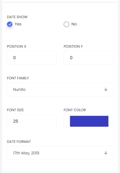 Date Show: This setting allows you to control whether the date is displayed on the certificate by selecting Yes or No. You can also customize the date’s position, choose the preferred date format, and adjust its font style, font size, and font color to match your design requirements.
