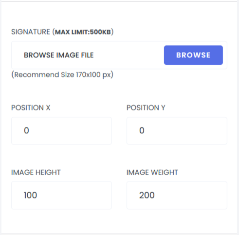 Signature: This section allows users to upload a signature image for the certificate and customize its placement. Users can define the position of the signature as well as adjust its height and width to ensure proper alignment and visual consistency.