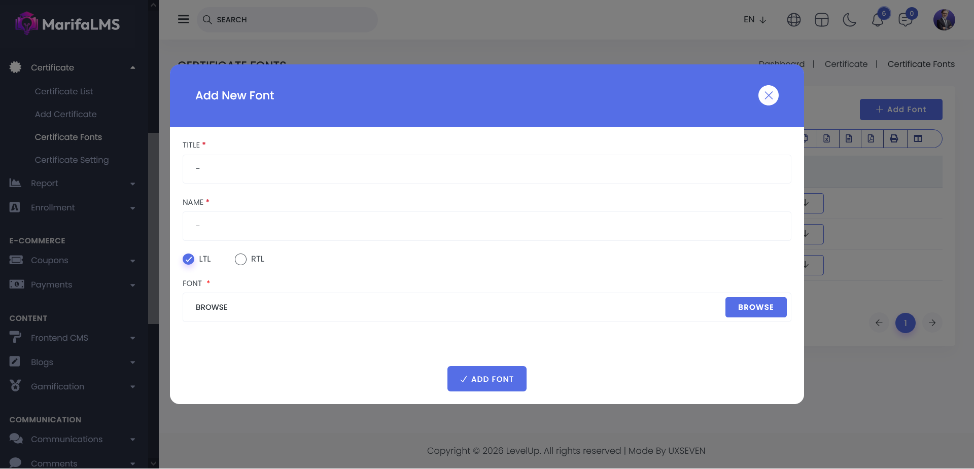+ Add Font Button : Clicking the +Add Font button opens a modal window where users can create and configure a new font for use in certificates.