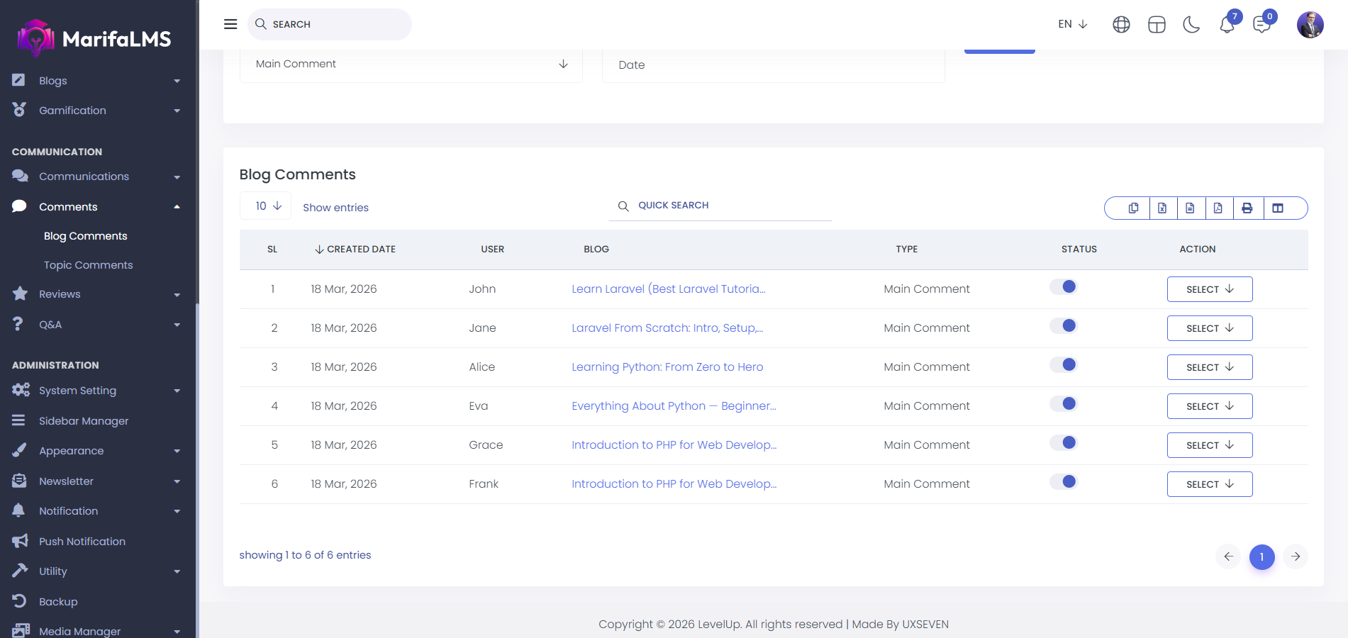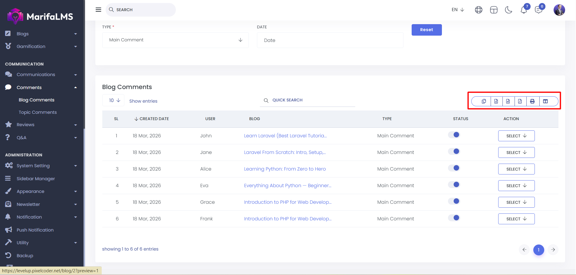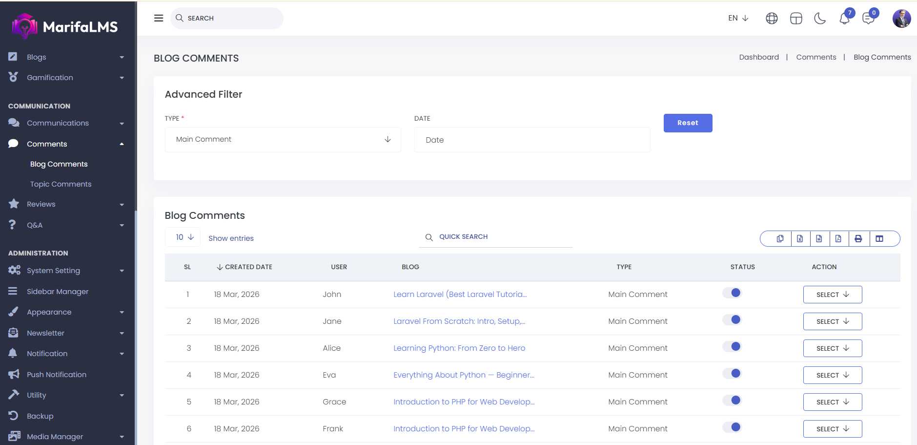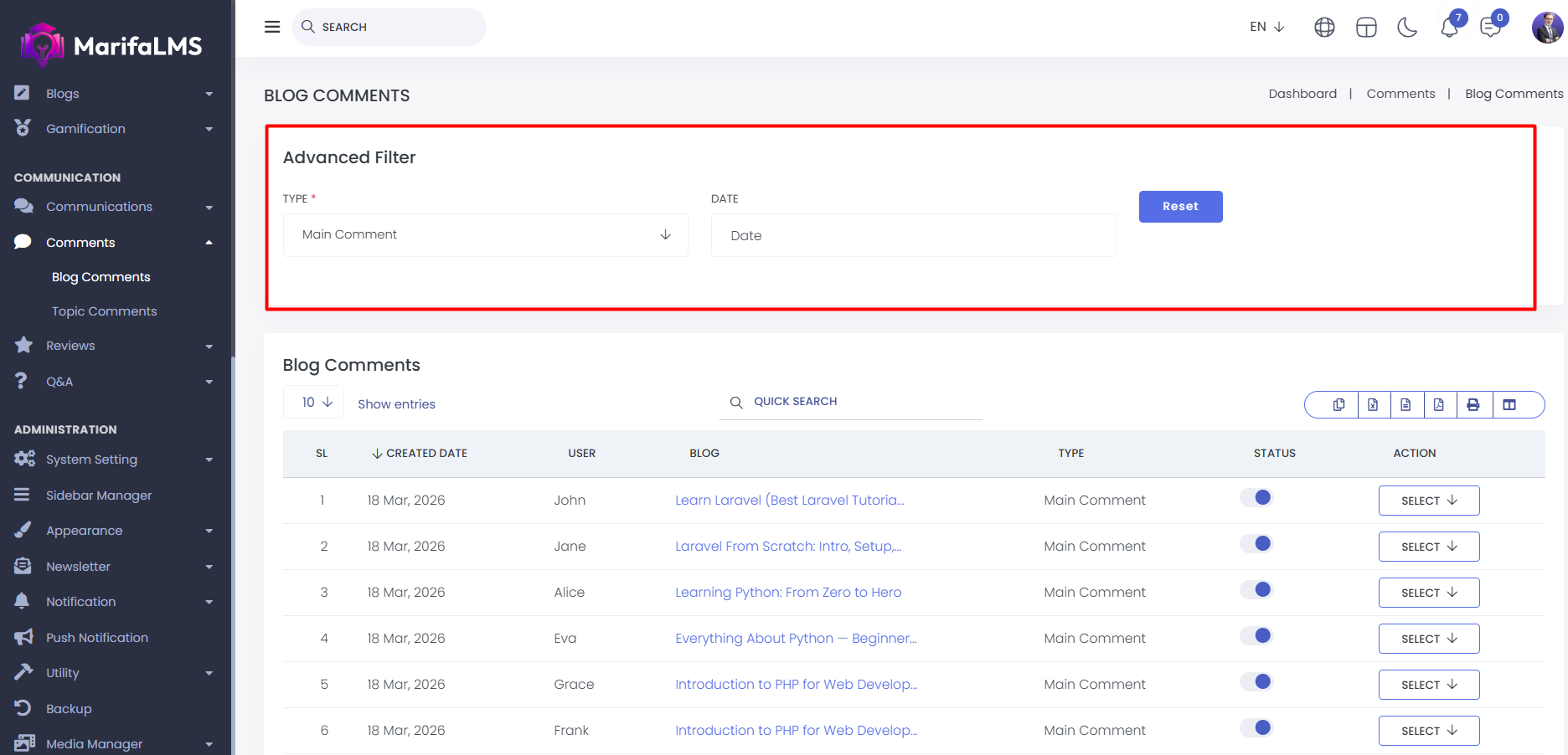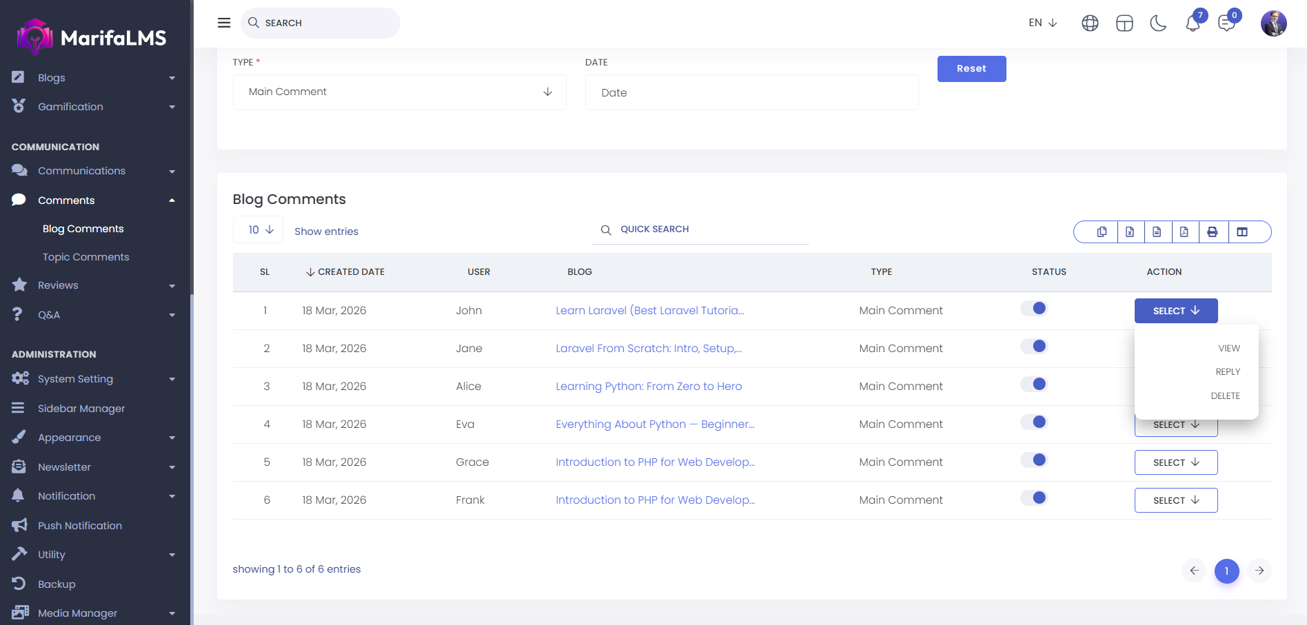 Blog Comments : From here, you can view the complete list of blog comments. The details include SL, created date, user, blog, type, and action at a glance.