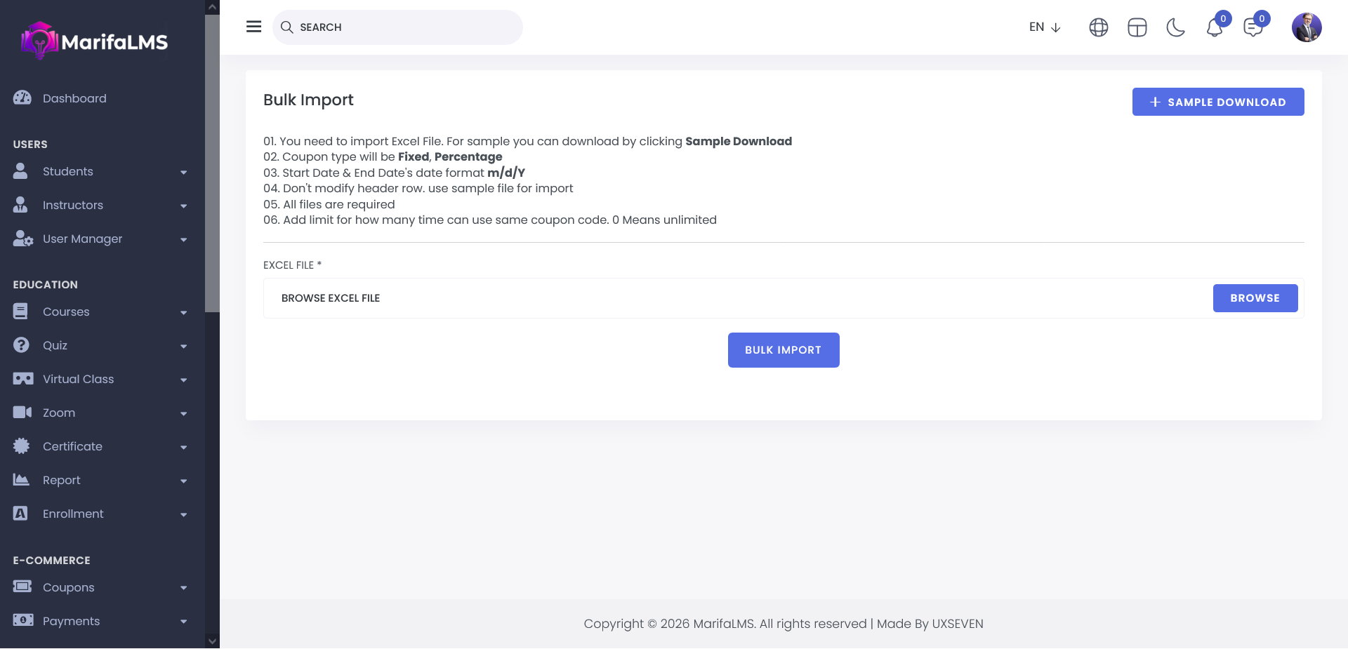 Coupons can be imported in bulk using an Excel file. To prepare the file correctly, you can click the Sample File button to download a template. The Excel file should be populated following this template, after which it can be uploaded to successfully import the coupons.