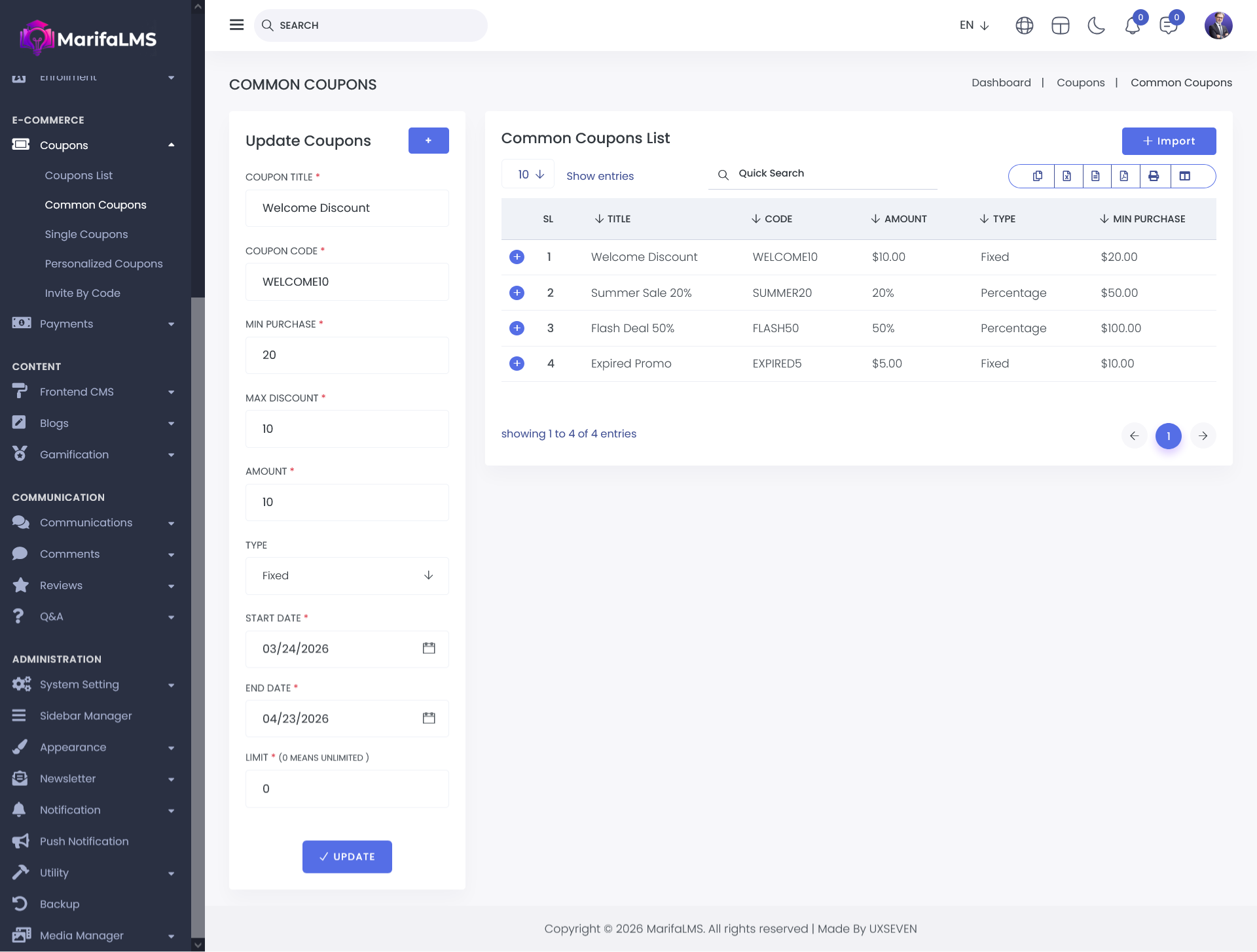 The Common Coupon section allows administrators to create new coupons, import existing coupons, and view all created coupons in the Common Coupon List.