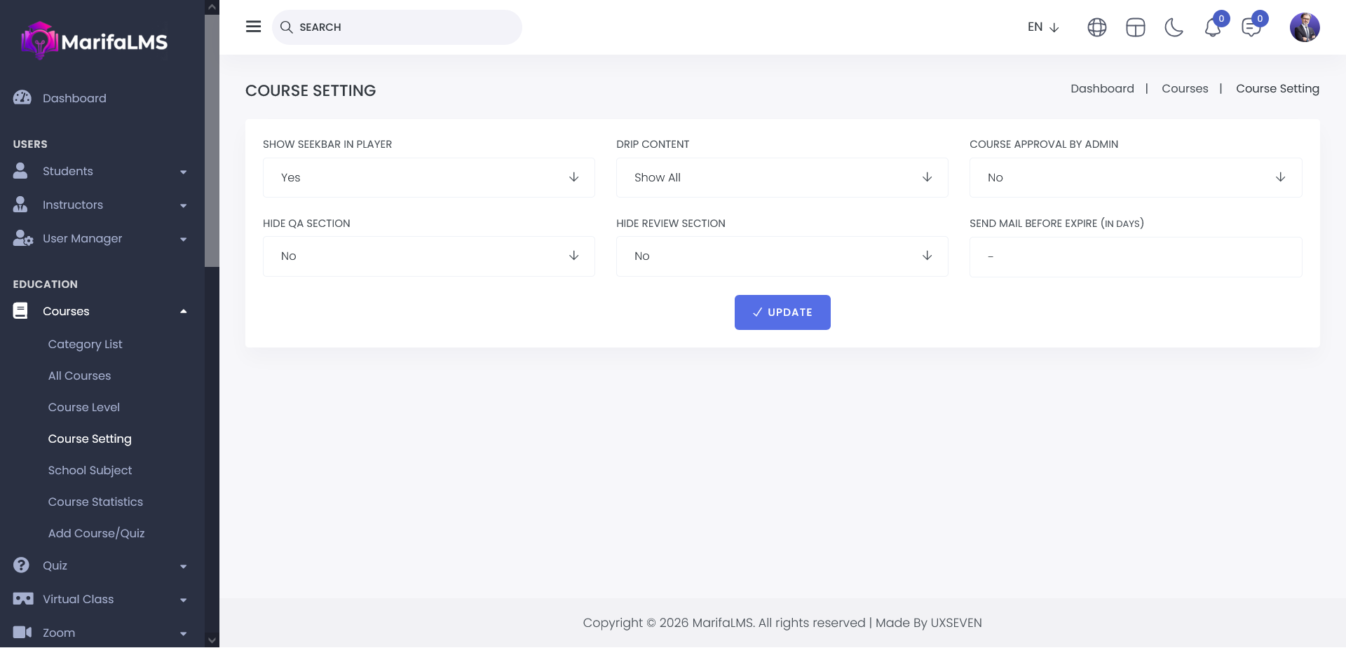 The Course Settings section allows you to configure various options to control course behavior and user experience.