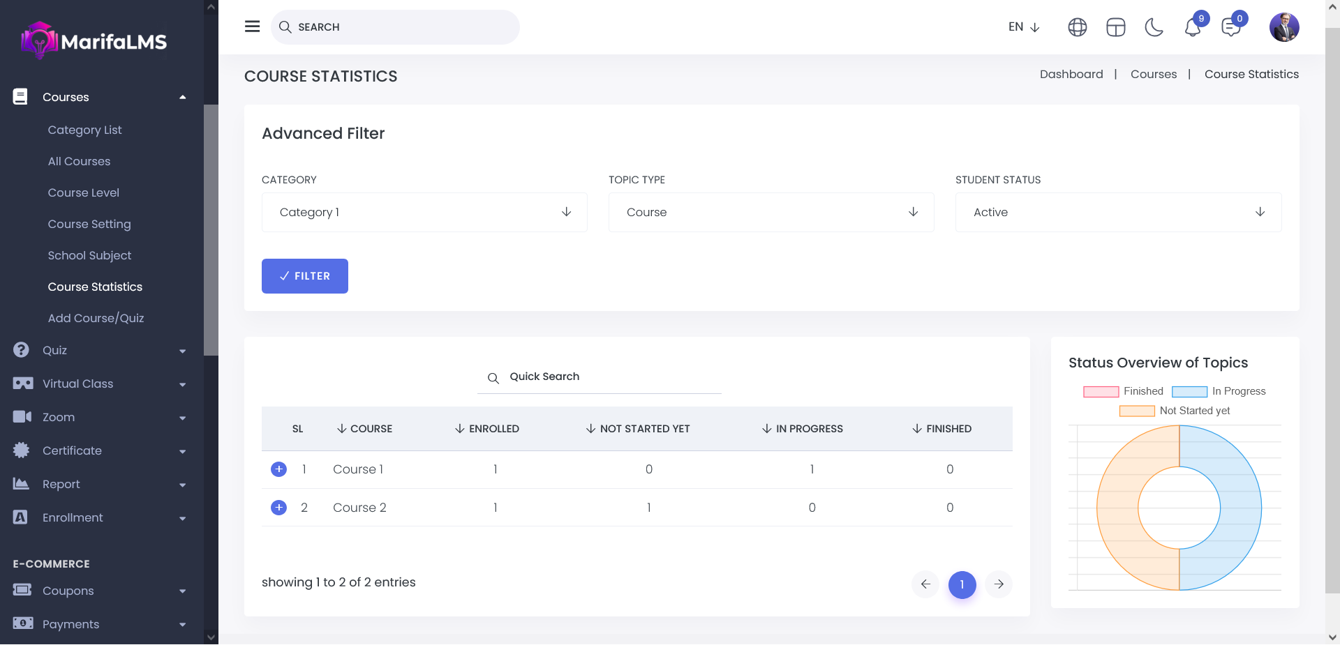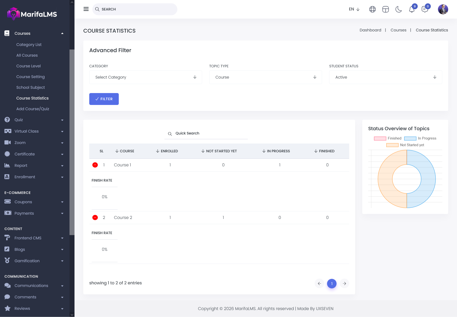 The Course Statistics section provides a comprehensive overview of course performance and user engagement. For each course, you can view: