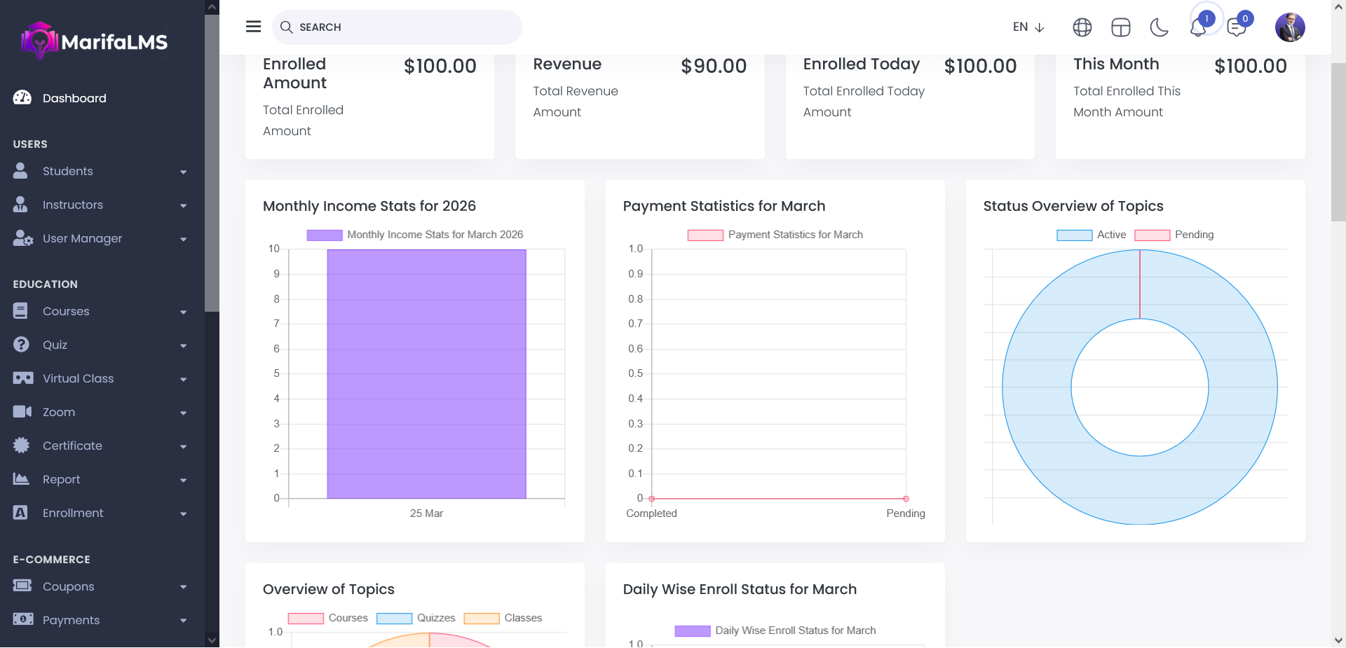 Dashboard: The dashboard provides a visual overview of all key information on your website in one place. You can view the total number of students, instructors, subjects, enrollments, enrolled amount, total revenue, today's enrollments, and this month's data.