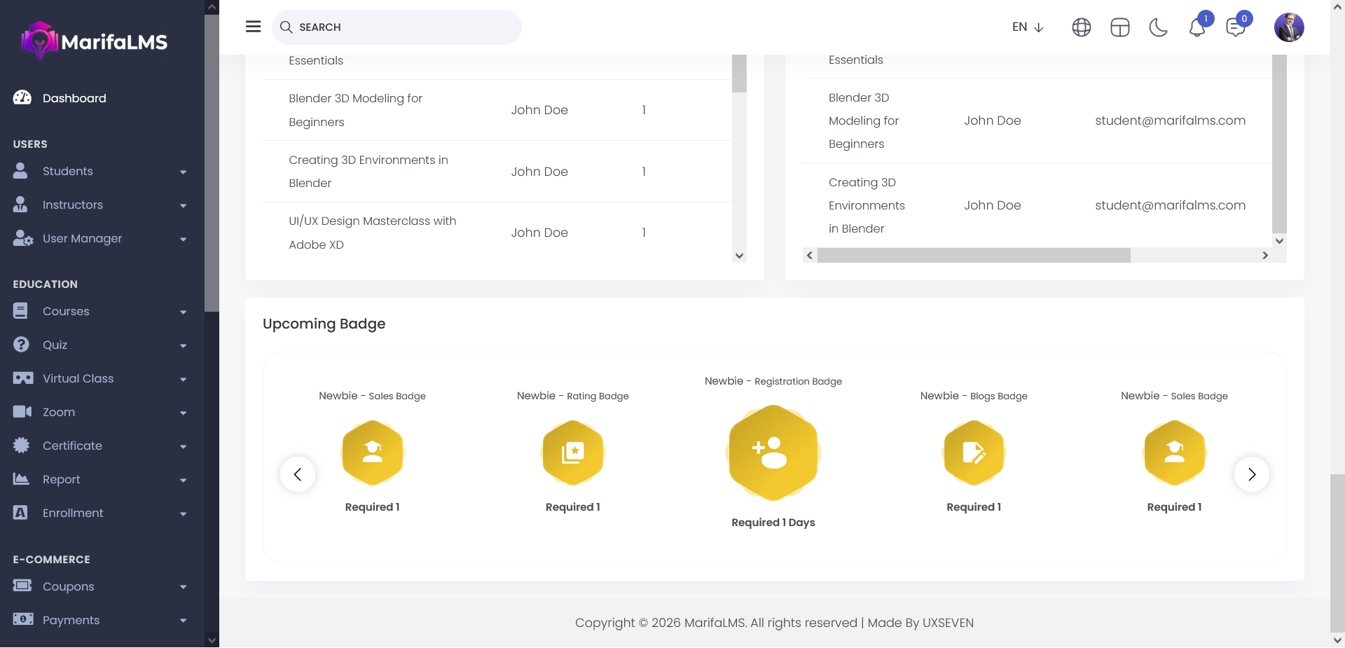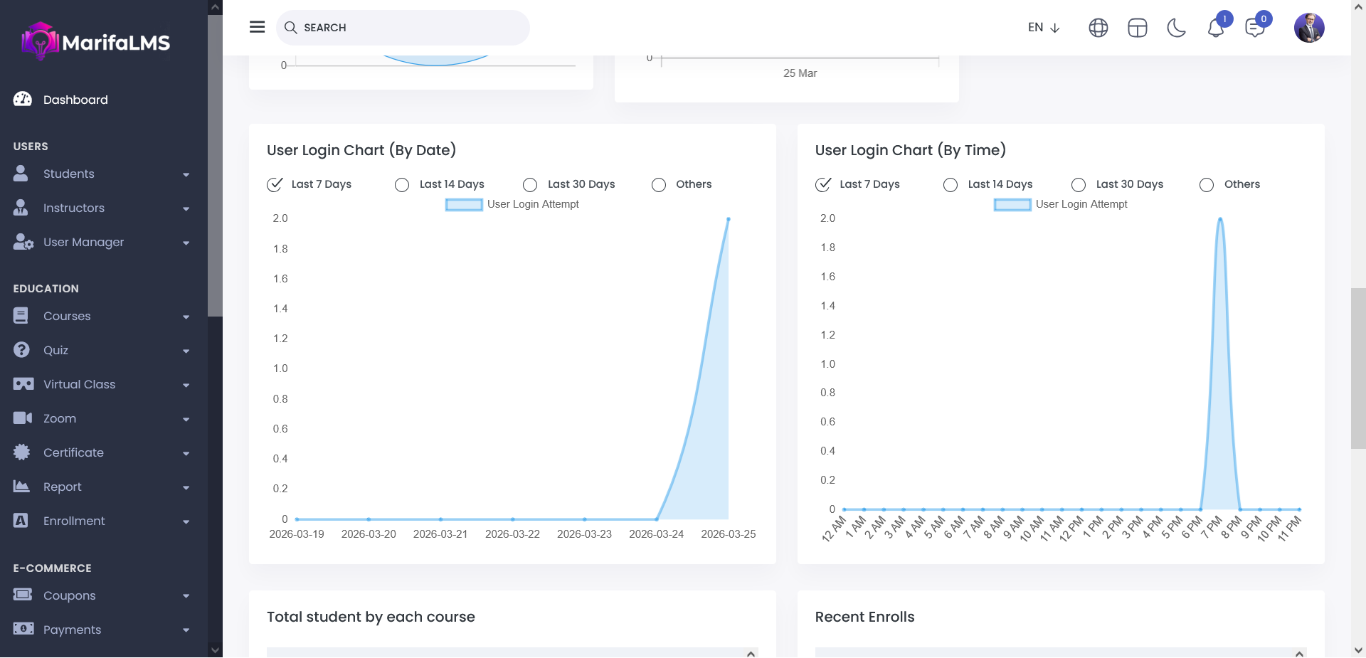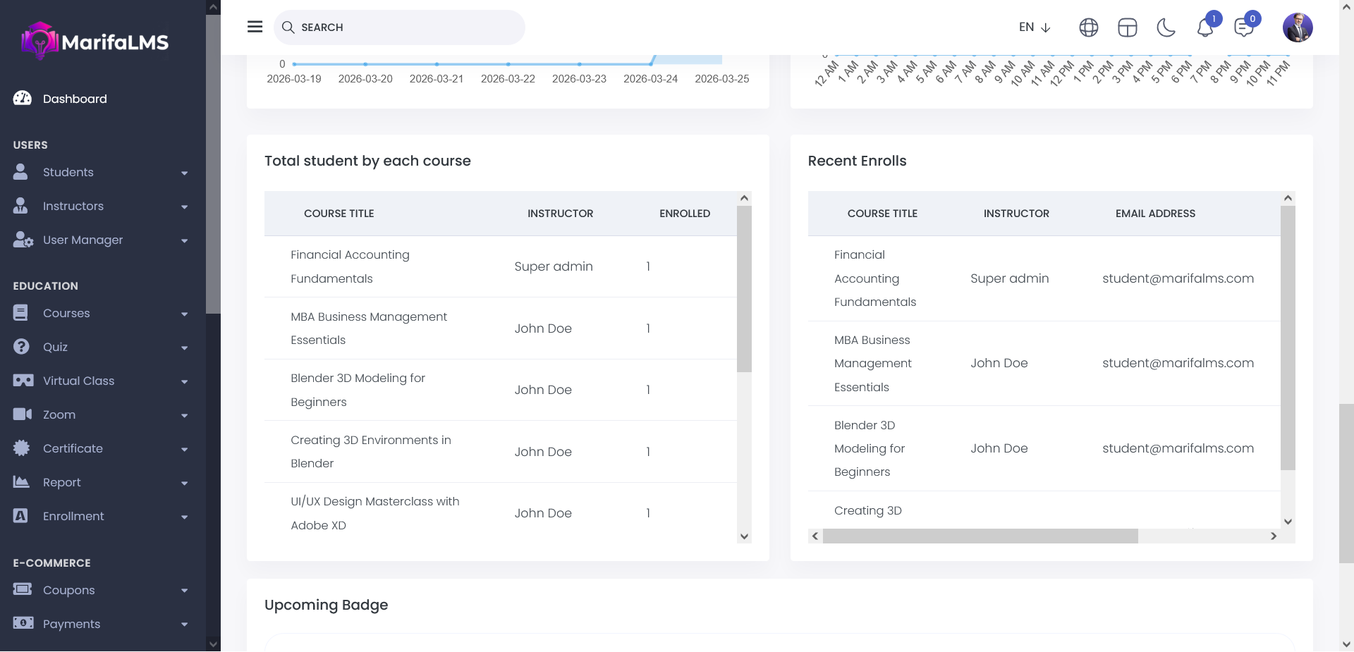 From here, you can view the total number of students enrolled in each course and the most recent course enrollments.