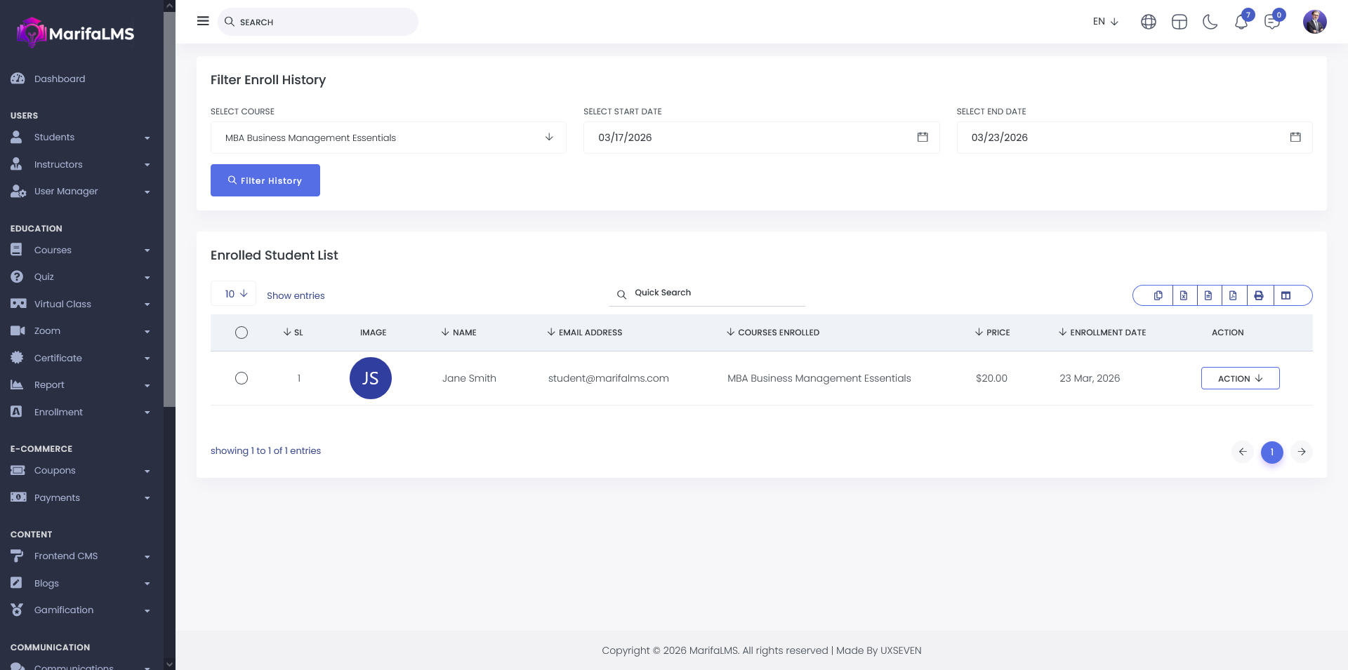 The Enroll History Filter allows administrators to refine data based on specific criteria, including Course, Start Date, and End Date. By applying these filters, the system will display results in the list according to the selected parameters, enabling more precise data analysis and reporting.