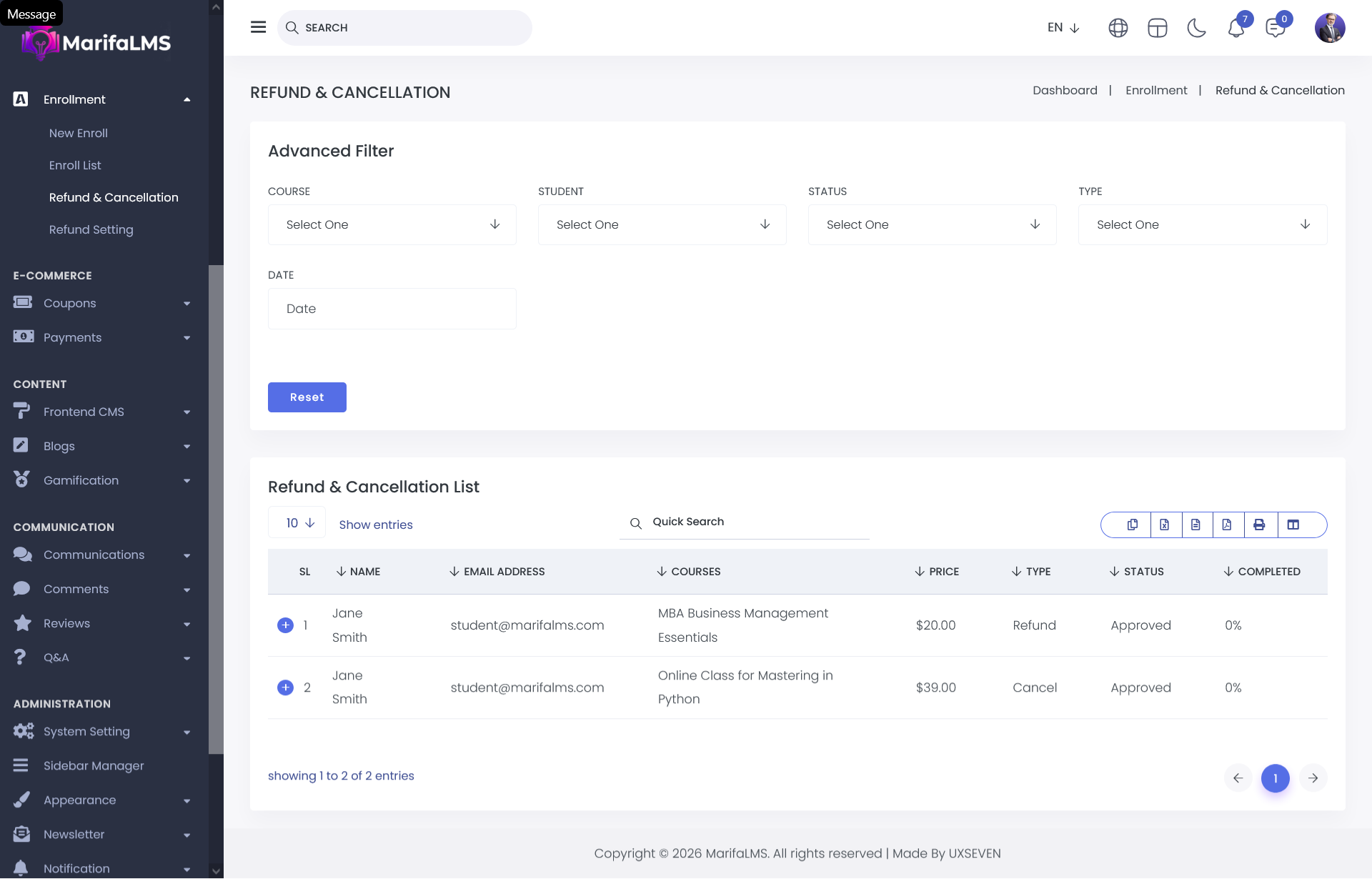 The Advanced Filter feature allows administrators to refine the list based on multiple criteria, including Course, Student, Status, Type, and Date. By applying these filters, the system will display results according to the selected parameters, enabling more efficient data segmentation and analysis.