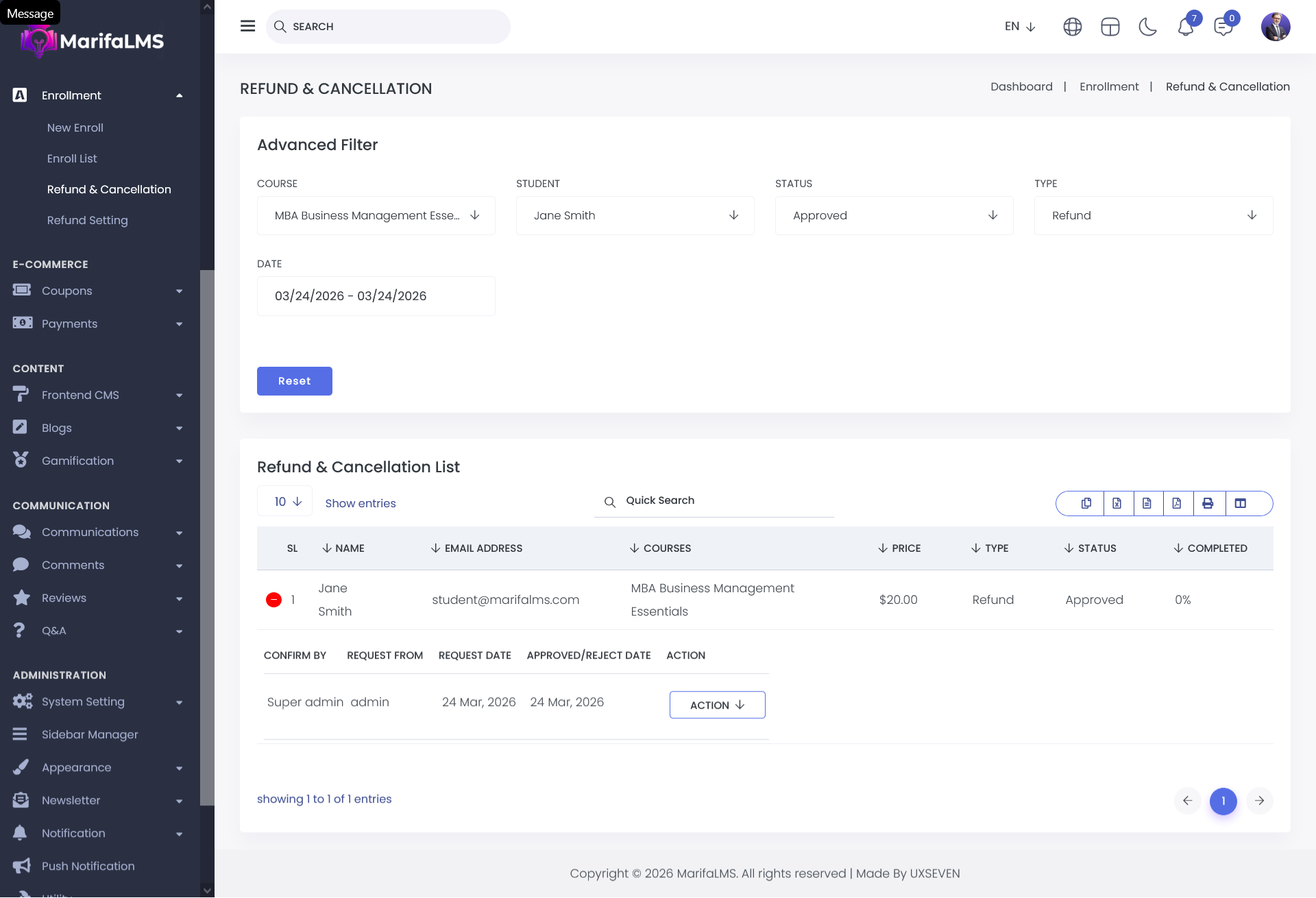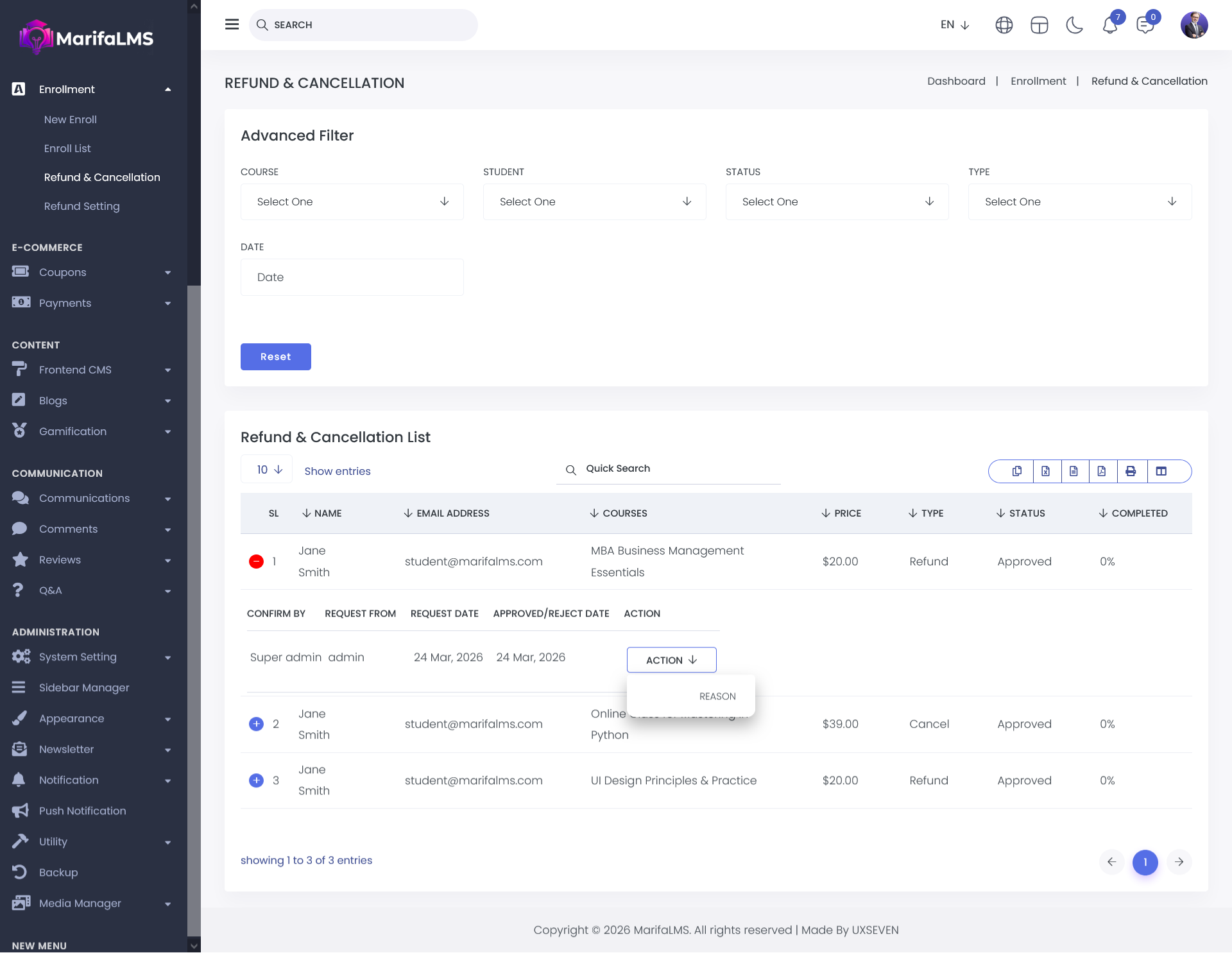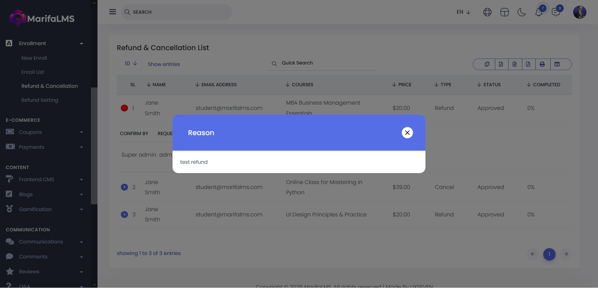From the Refund & Cancellation List, administrators can access the Action menu to view the reason associated with any course, quiz, or class cancellation or refund request. This ensures transparency and provides clear insight into user-initiated or system-driven refund and cancellation activities.