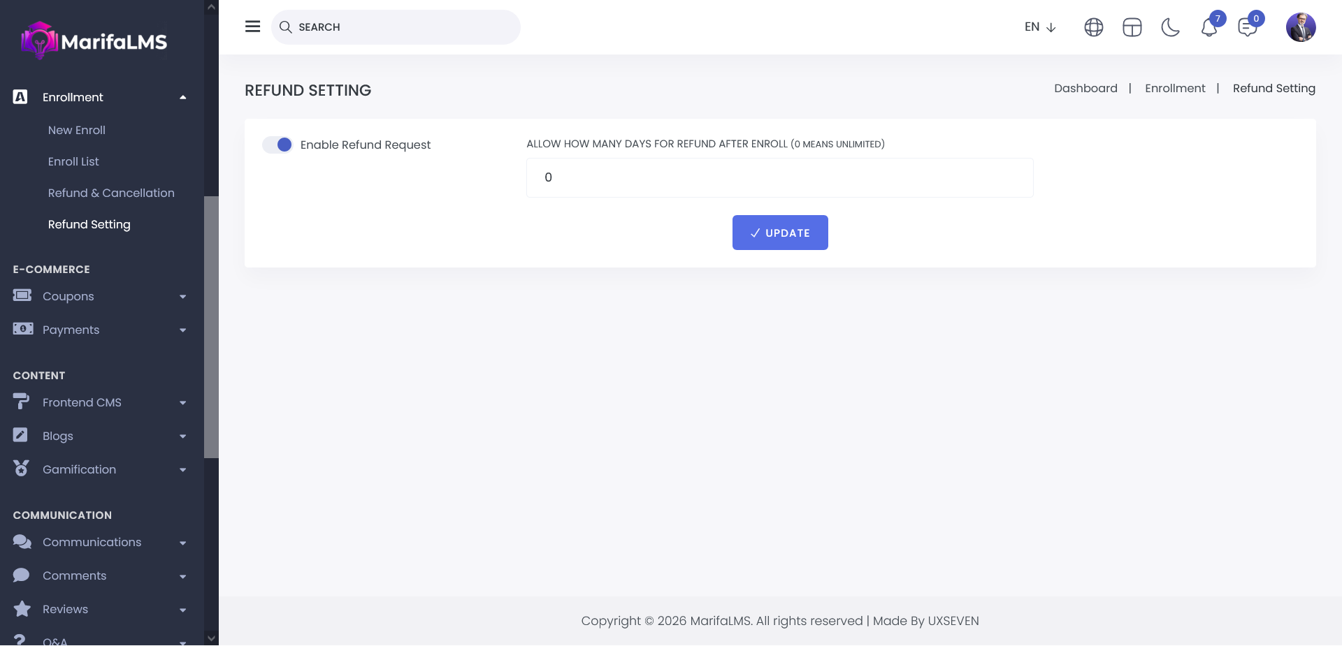 Within the Refund Settings, administrators can enable or disable refund requests using the dedicated toggle option. Additionally, the allowable refund period can be configured by defining the number of days after enrollment during which a Course, Quiz, or Class remains eligible for a refund.