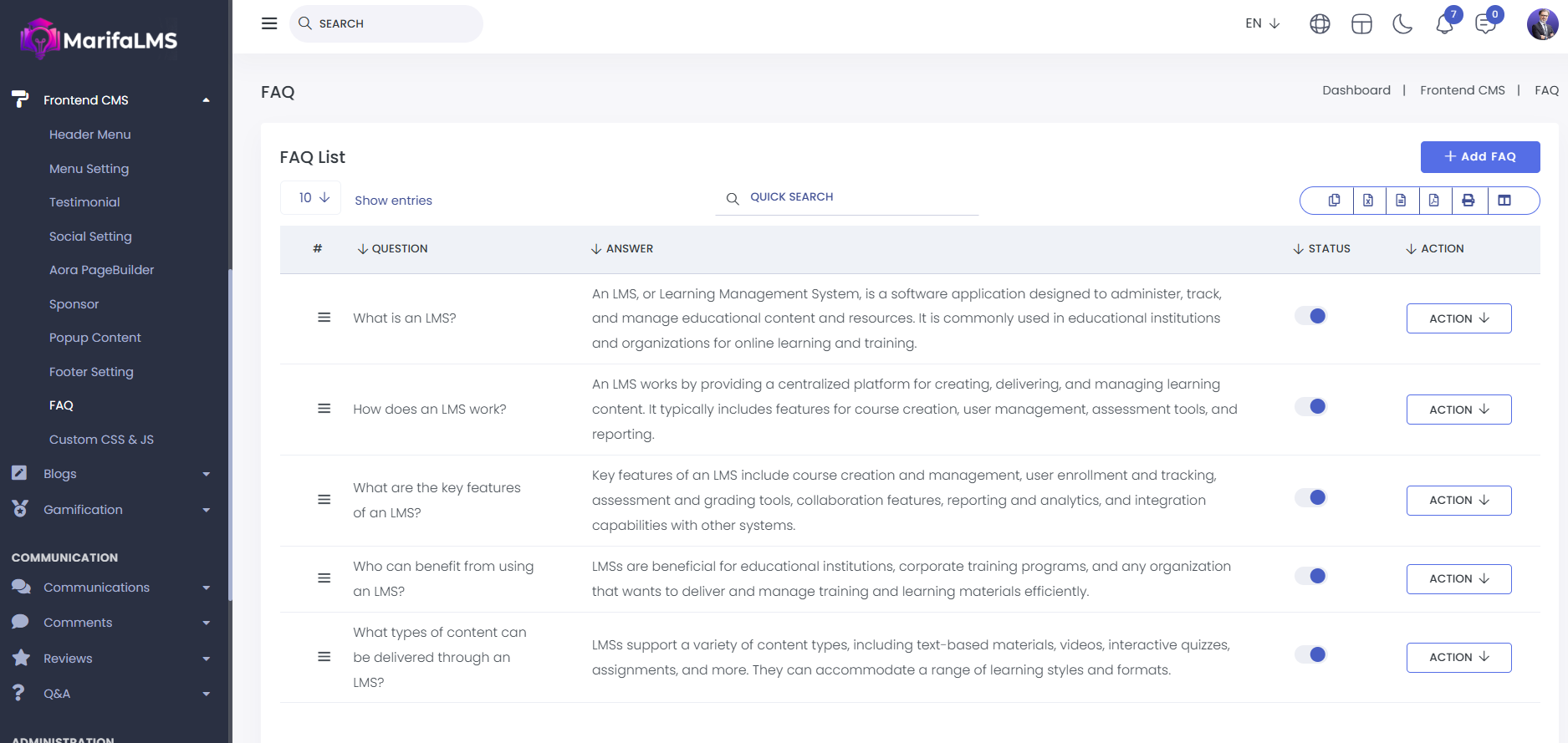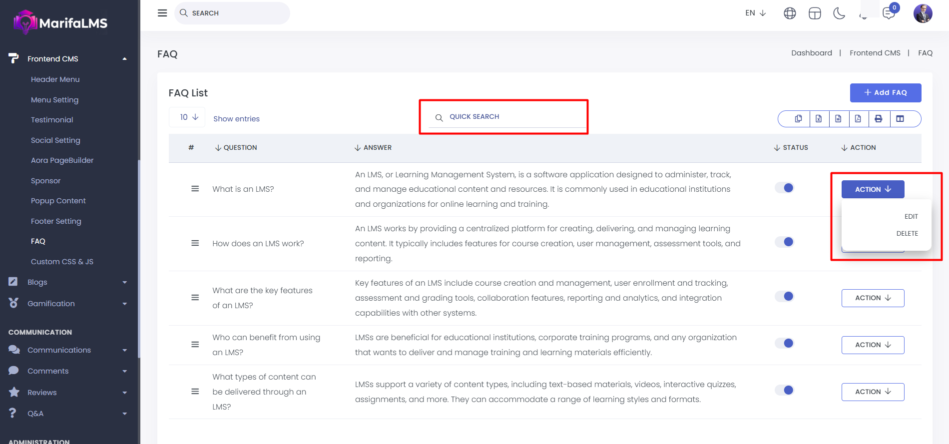 FAQ : From here, you can view the entire FAQ list. You can see the Questions, Answers, Status, and Action options.