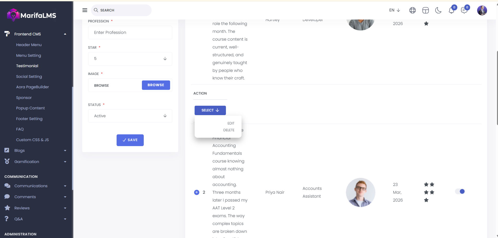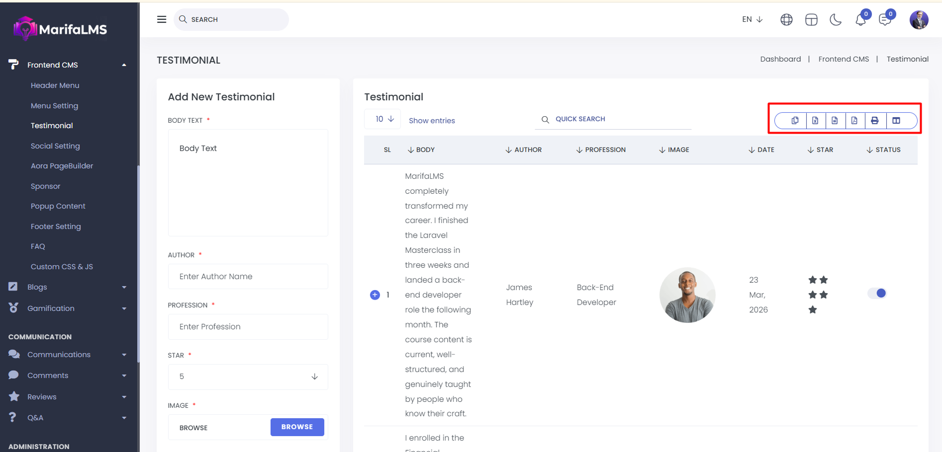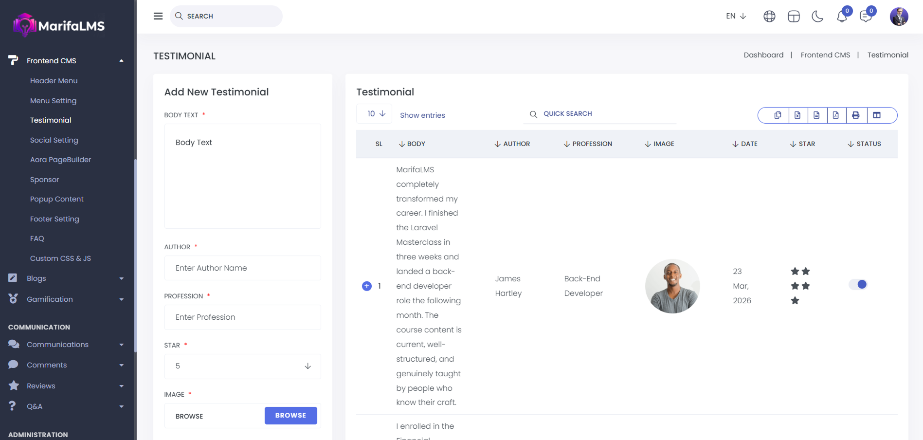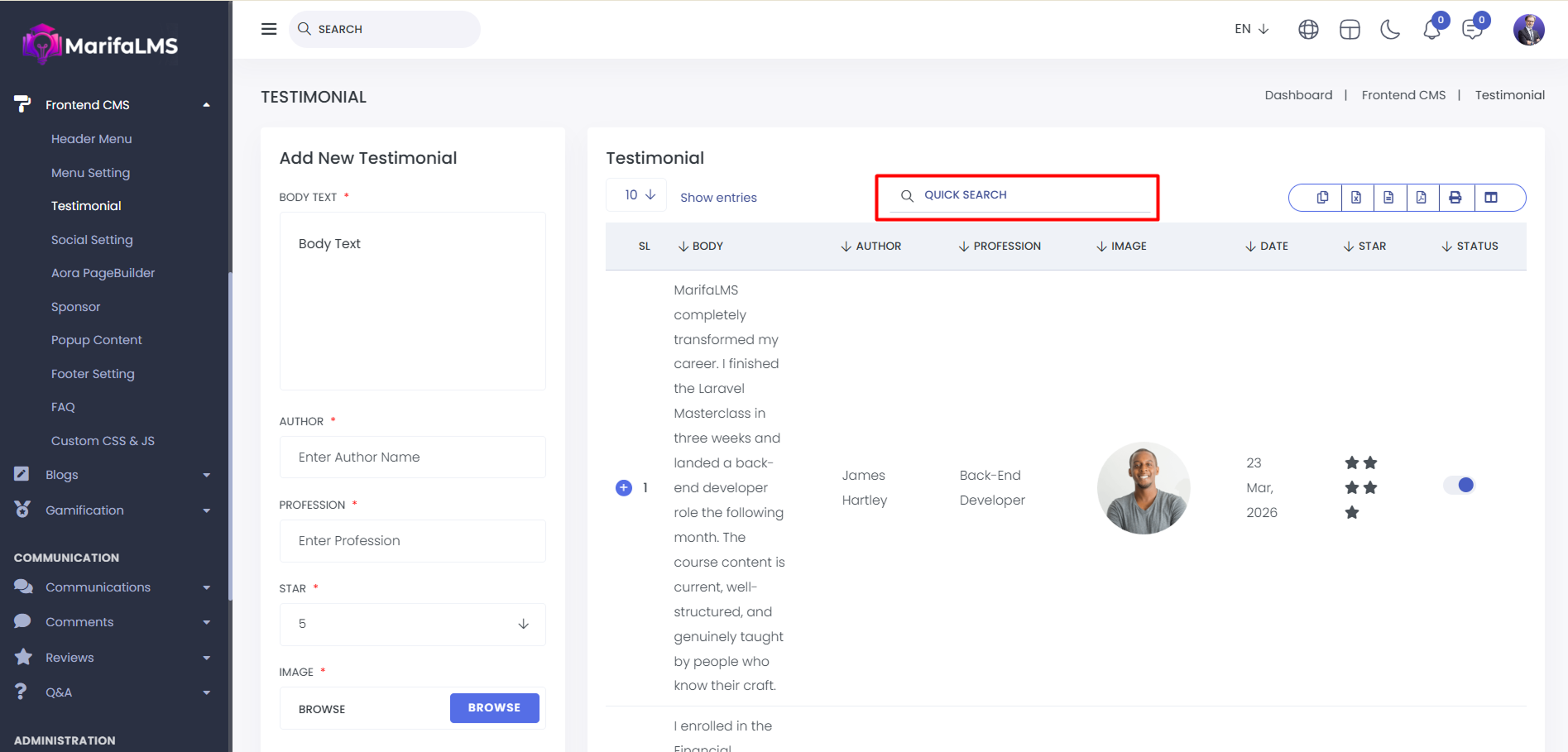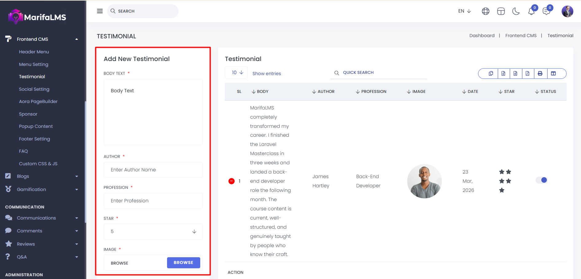 Testimonial: From here, you can view the testimonial list. You can see the SL, Body Text, Author Name, Profession, Image, Date, Star Rating, Status, and Action.