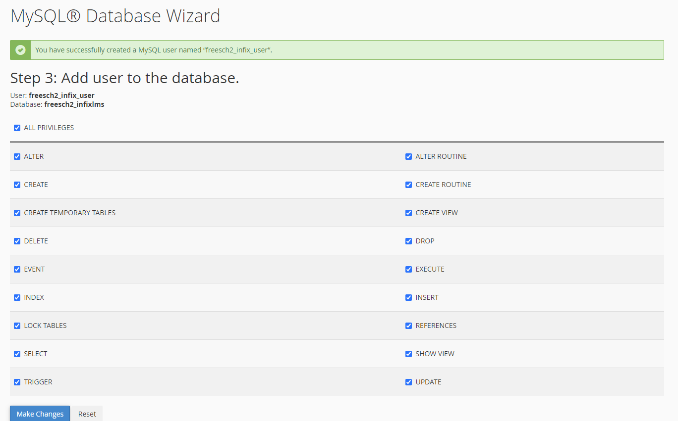 On the next page, you can assign privileges for a user so that the user has proper privileges for accessing, reading, editing, and deleting the database.
