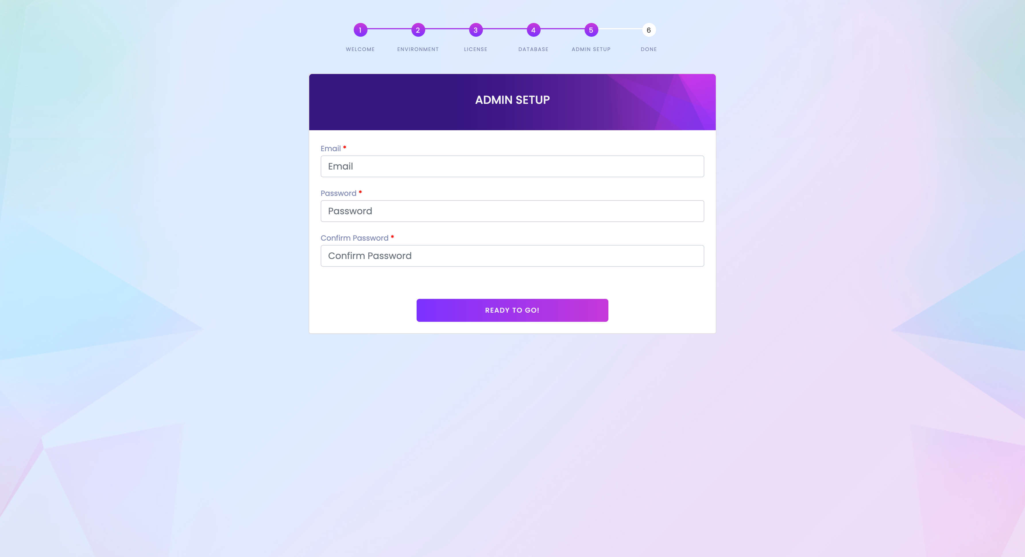 This is the admin setup from here to fill on the email, and password & ensure the confirmed password. Then click on the ready-to-go option.