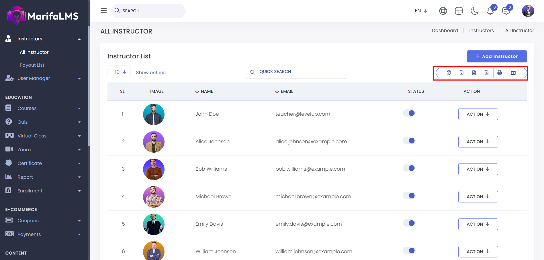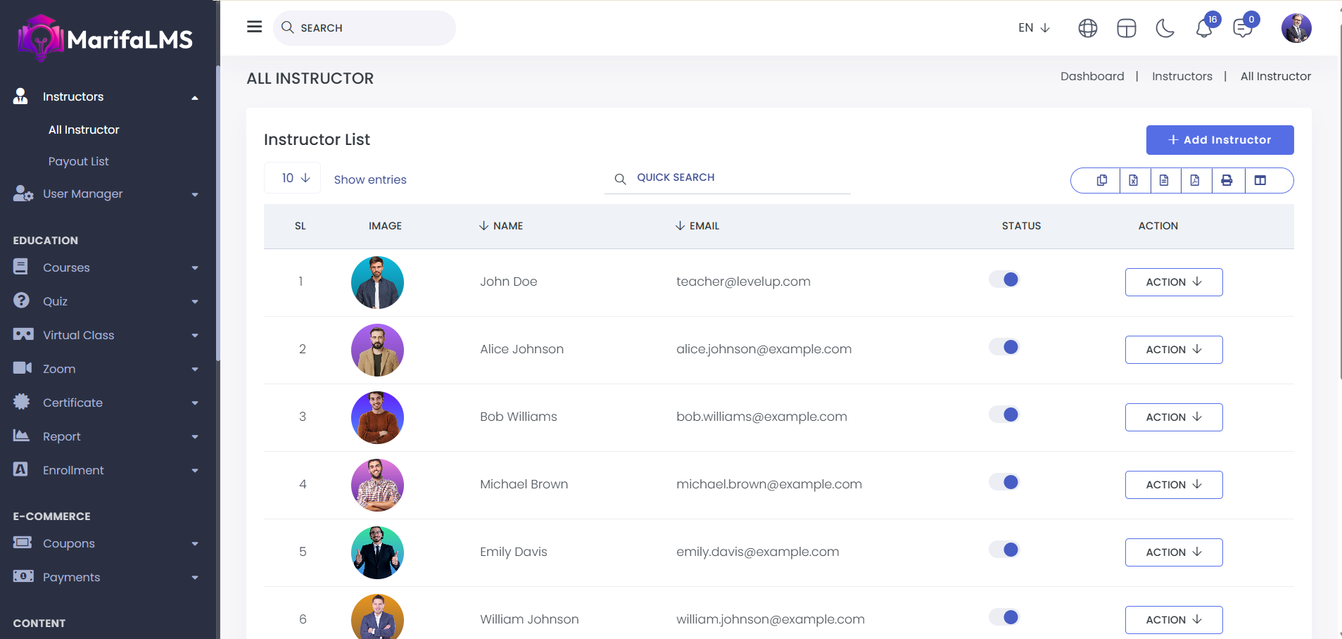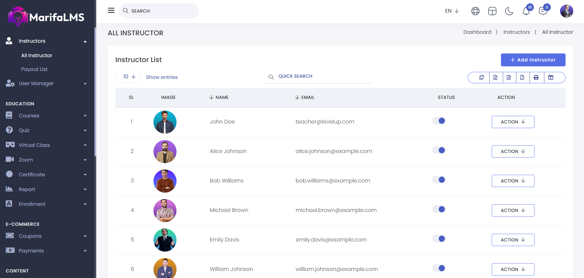 Instructors: From here, you can view all the instructors along with their details, such as SL, Name, Image, Email, Status, and Action.
