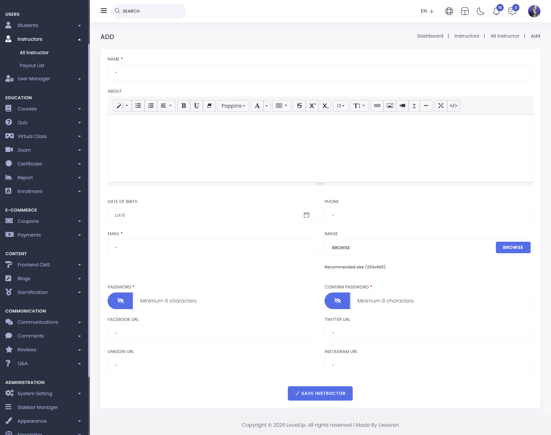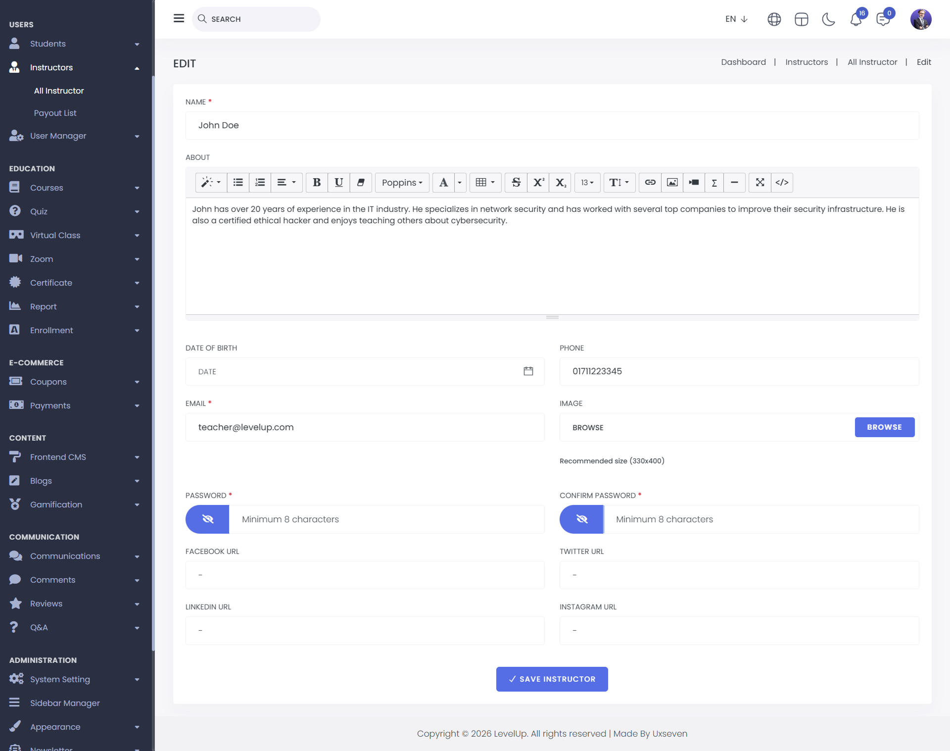Add New : You can add a new instructor by clicking on the "Add New" button. After clicking, fill in the following details: Name, About, Date of Birth, Phone, Email, Image, Password, Confirm Password, Facebook URL, Twitter URL, Instagram URL, and LinkedIn URL. Once all fields are completed, click "Save Instructor," and the new instructor will be created successfully.