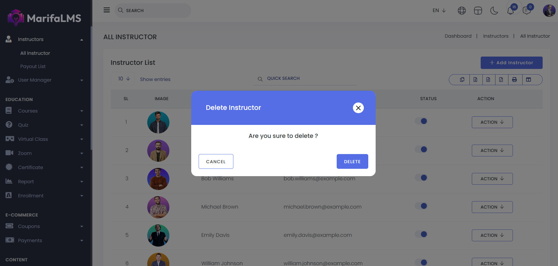 Delete: By clicking here you can delete any instructor you want.