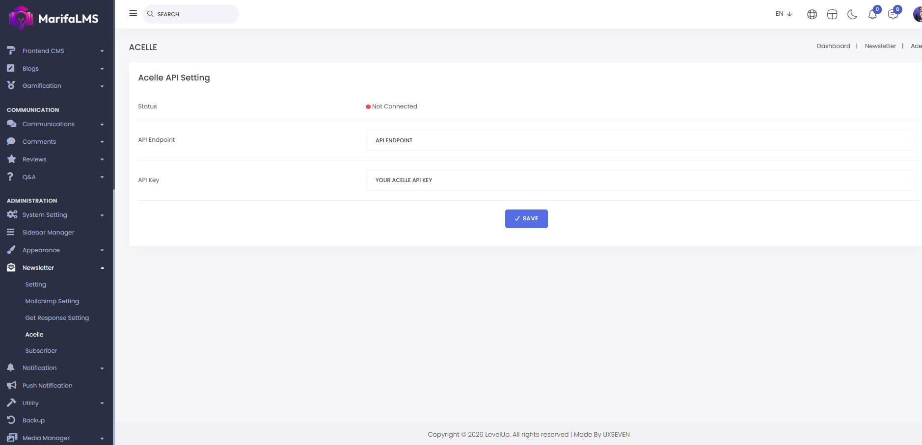 Acelle: From this page, you can configure your Acelle settings. You can check the connection status, set the API endpoint, and enter the API key. Once the setup is complete, click "Save" to update your settings successfully.