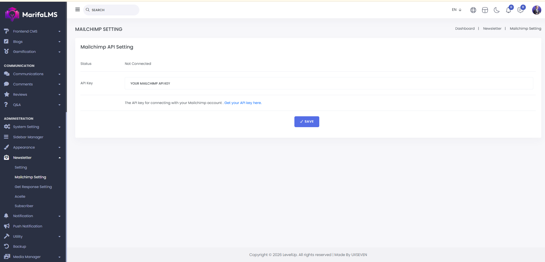 Mailchimp Setting: Here, you can configure Mailchimp settings and check the connection status. Enter the API key and click "Save" to update your Mailchimp settings.