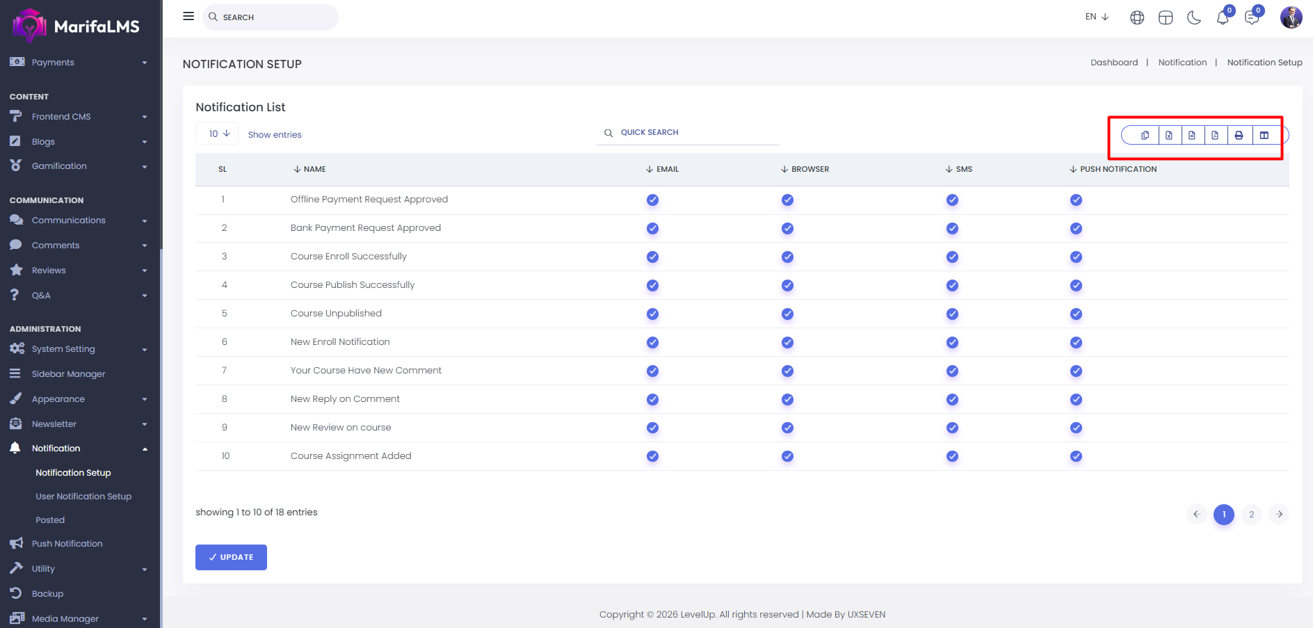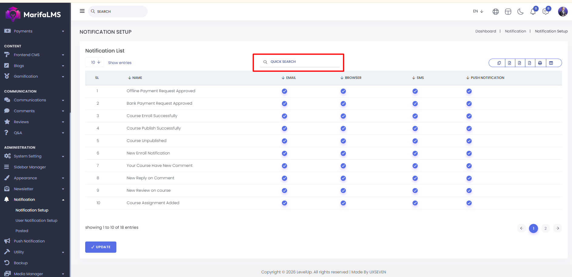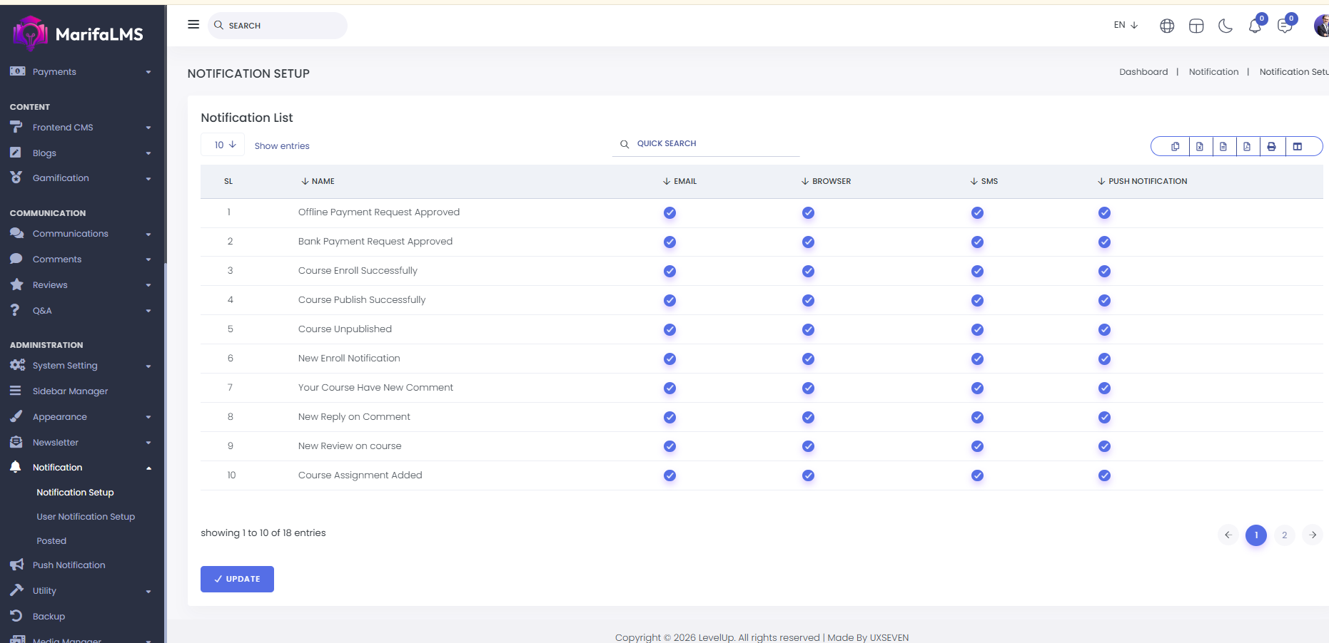 Notification Setup: From this page, you can view and manage all notification setup options. You can choose how to send notifications—via SMS, email, browser notifications, or push notifications—by checking or unchecking the corresponding options. Once you’ve made your selections, click "Save" to update your settings successfully.