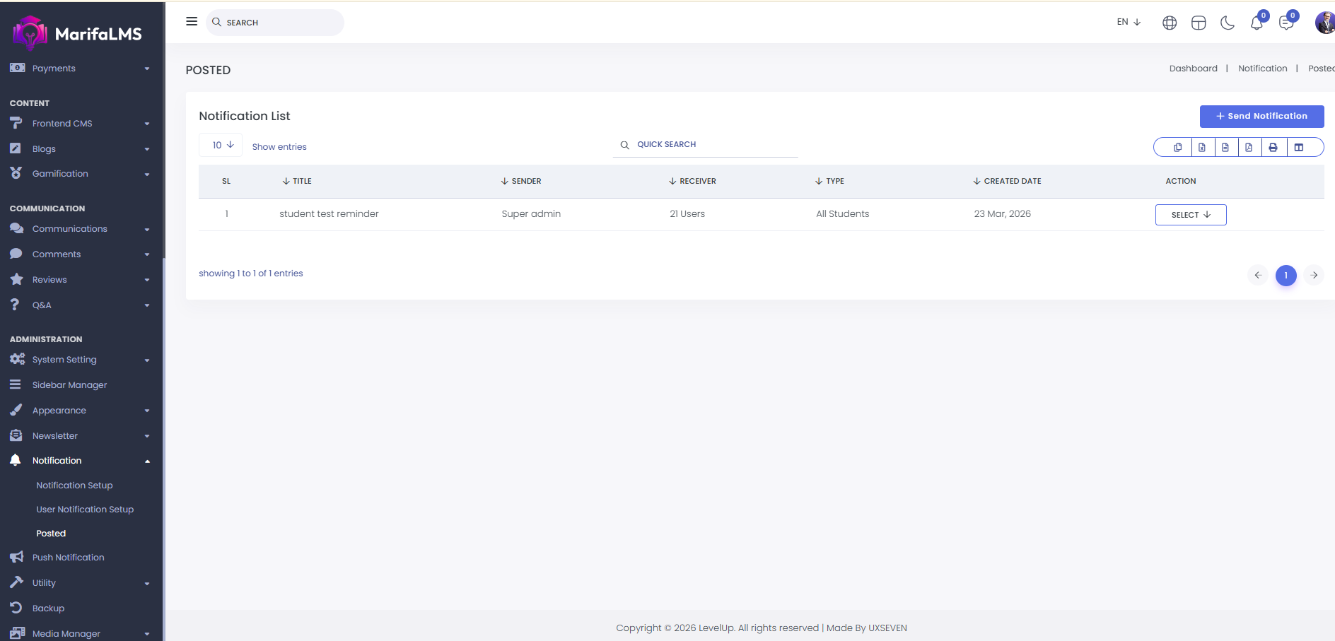 Short Direction: { Levelup > Dashboard> Posted> Notification List> Send Notification> SL> Title> Sender> Receiver> Type> Created Date> Select> Title> Type> Message> Send.}