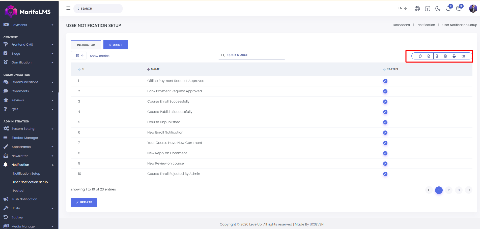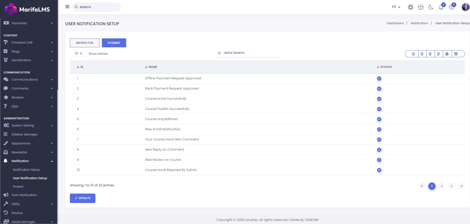 User Notification: From here, you can view the notification list for all instructors and students. You can configure which actions will send notifications and which will not.