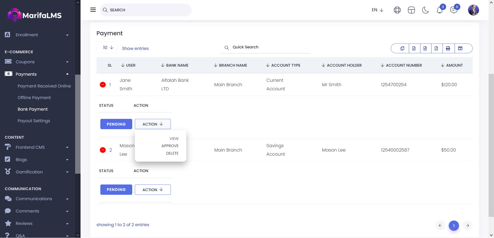 Bank Payment: The Bank Payment section displays all transactions completed through bank transfers. It provides a comprehensive overview, allowing administrators to monitor and manage bank-based payments efficiently.