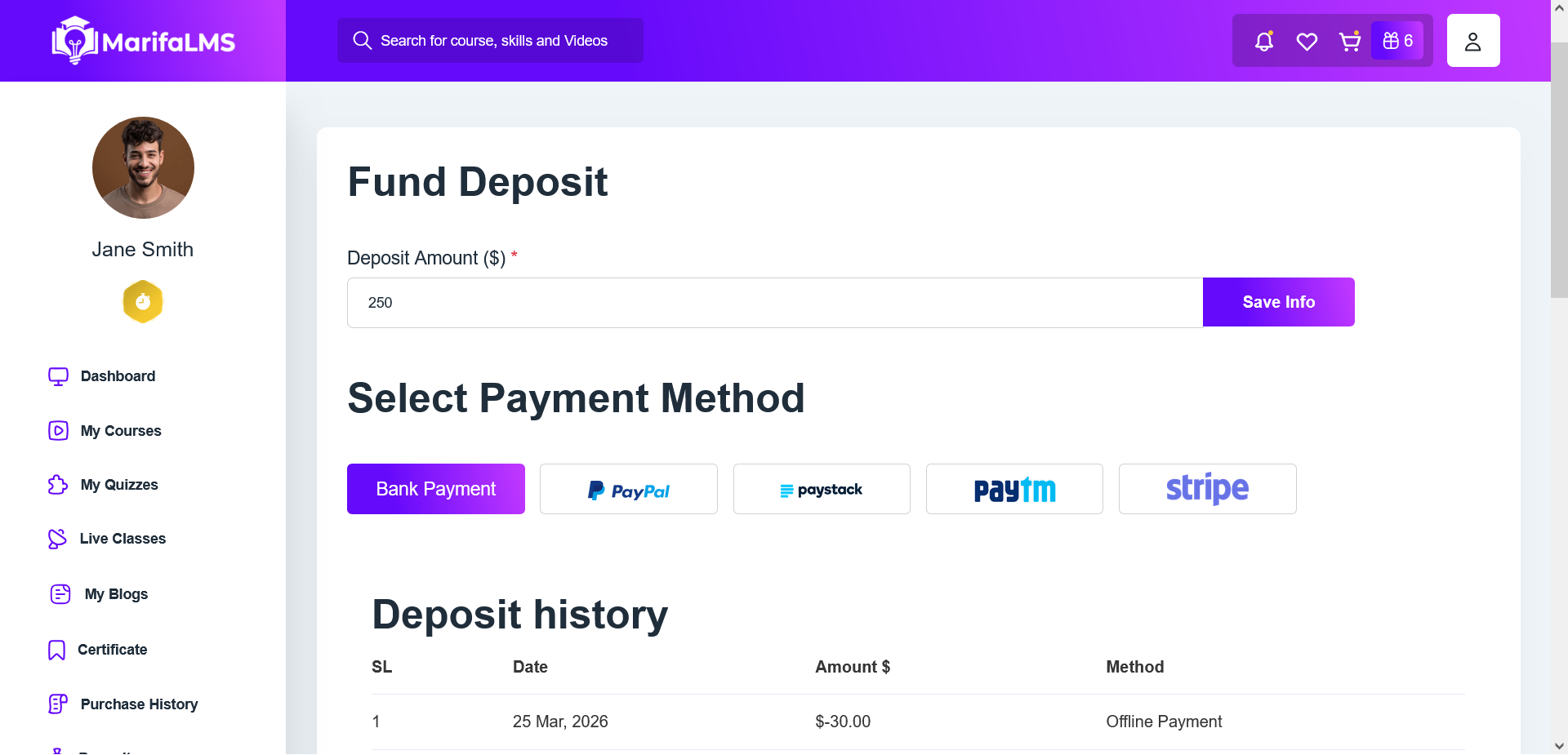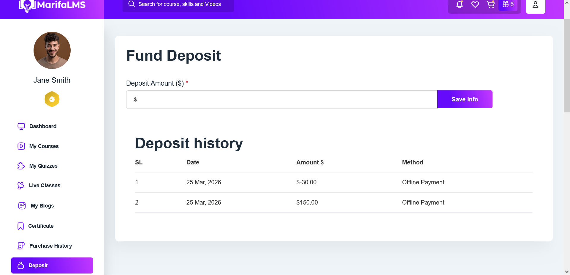 To do this payment you have to go to the student panel then click on deposit. After clicking type down the deposit amount and click on save info button.